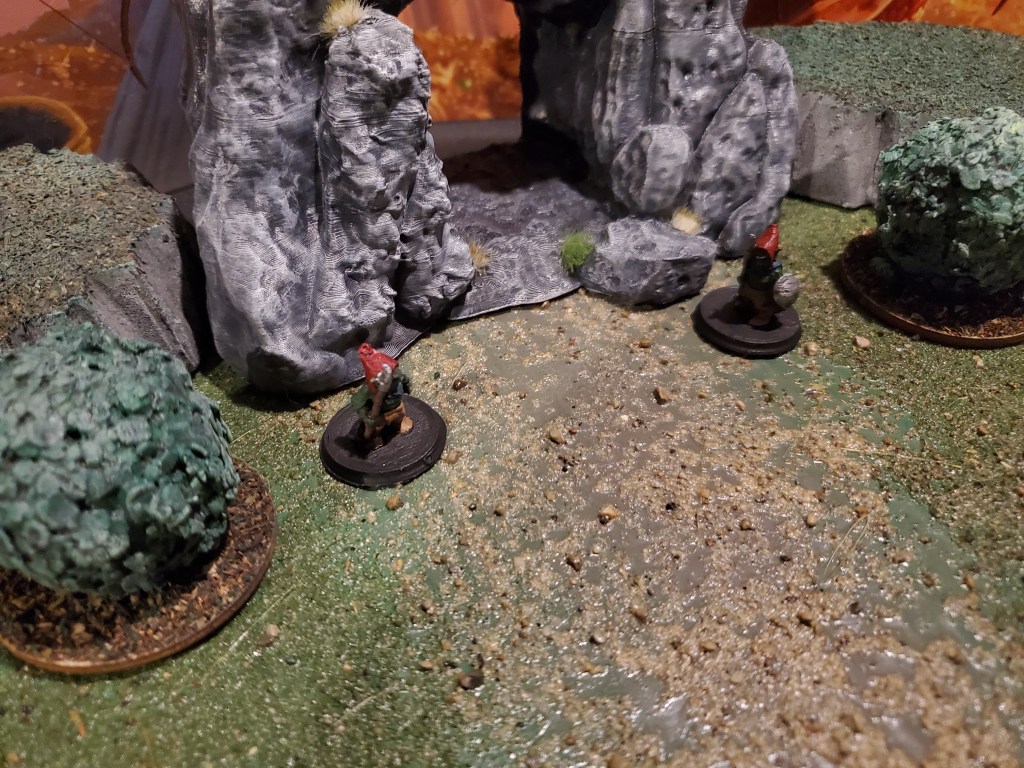 The first part of the adventure has the party arriving at the entrance and finding the guards. Two more goblins are on patrol in the area. If the PCs don’t encounter them here, they will join the fight in the offering room. The trees are made with air dry clay, Styrofoam ball cut in half and coated with PVA glue and oatmeal. I got that idea from Frank D. Crafter. The bigger bushes are similar to the trees and the small bushes are 3D printed. The cave entrance is 3D printed as well.