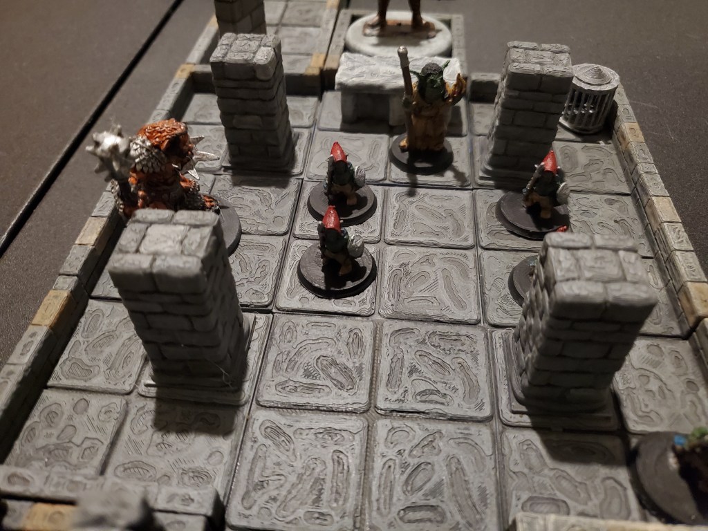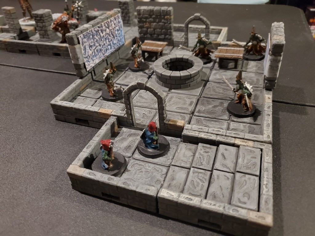 While running this dungeon, I would only have the parts the PCs can see on the table. All of the parts have internal clips so I can snap them together quickly and add the scatter pieces. The dungeon tiles are all from Hero’s Hoard, except the archway tiles. I made those by combining elements together myself from the Hero’s Hoard tiles.
