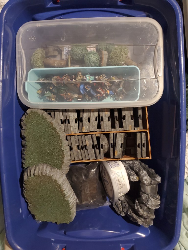 Here are all of the tiles, scatter terrain, and miniatures in the container. I also have little bags of polyhedral dice to hand out to the player if they don’t have any dice. If the player says they don’t own any dice, they get to keep the dice at the end of the night.