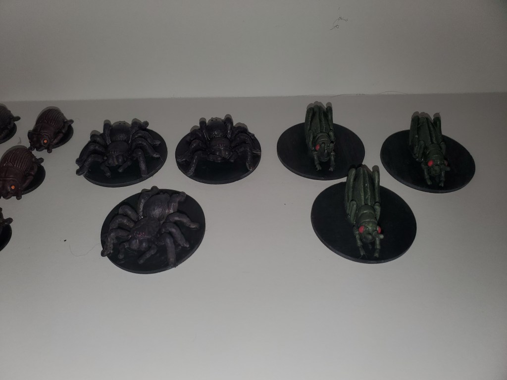 I also got a group of 12 beetles painted up. I already had some beetles but I wanted more. One of my friends had been running a D&D 5E game (I usually am the DM, but I am getting a chance to play). Last week, we encountered some giant bugs in an underground cavern. We used some lizard miniatures as a stand in so I thought I would make him some bugs. I got the bugs from a video I saw from Crafts and Minis. Great channel but he hasn’t had a new video in over a year. Simple paint job but now we have bugs!