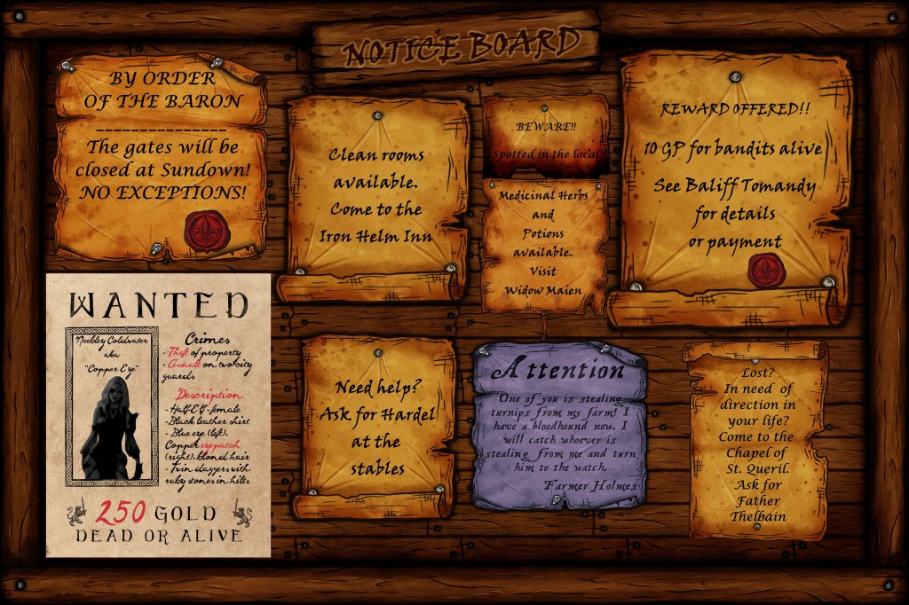 I used a program called Paint.net , to make the notice board. It is free software that is a lot like PhotoShop. It allows you to place a background in the template then add layers to the image. That way, you don’t have to recreate the board every time. Below is the image of the 1st notice board that I handed out to the party when they arrived at the fort.