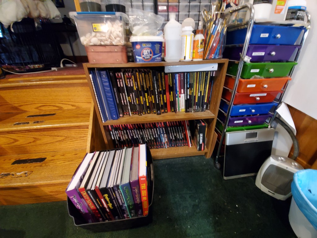 While cleaning up the office, I stopped and took some pictures of my game collection shelves. The top of this bookcase has a lot of items for crafting terrain. There are paints, Mod Podge, glues, adhesives, etc. plus an organizational bins case labeled with 1″ disks (counting chips), wooden circles, etc. The colorful shelf to the right have my flock, moss, plants, string, tape, bigger tools that don’t fit on the desk, etc)