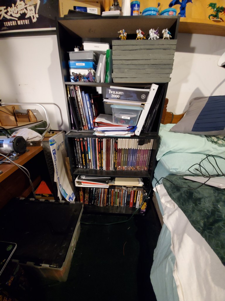 The 2nd bookcase is actually two 2-shelf bookcases stacked on each other. The bottom shelf has my Star Wars RPG books from Fantasy Flight Games and the older Wizards of the Coast edition. I had a lot of these books… Also on this shelf are my Vampire books, Werewolf books, as well as my Dungeon Crawl Classics and Mutant Crawl Classics books by Goodman Games. While I haven’t gotten to play either of those games, I would really like to try it out one of these days. Maybe a one-shot for a holiday?