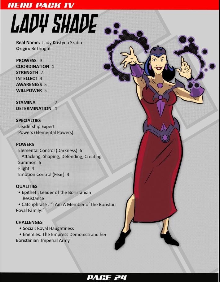 The 1st bookshelf has all of my superhero RPG materials on the top shelf. There is a BUNCH of Mutants and Masterminds on this shelf (almost everything made by Green Ronin, plus a lot of the extra material published by Vigilance Press. There are also all of the Marvel Heroic Books that were printed, the Marvel Universe RPG books, and ICONS. I even did a Kickstarter for ICONS Hero Pack 4 at a level where I could design and include a hero in the book. I sent in my wife’s favorite character from City of Heroes, Lady Shade. I sent in a small backstory and a screenshot from the game and below is what was included int he book: