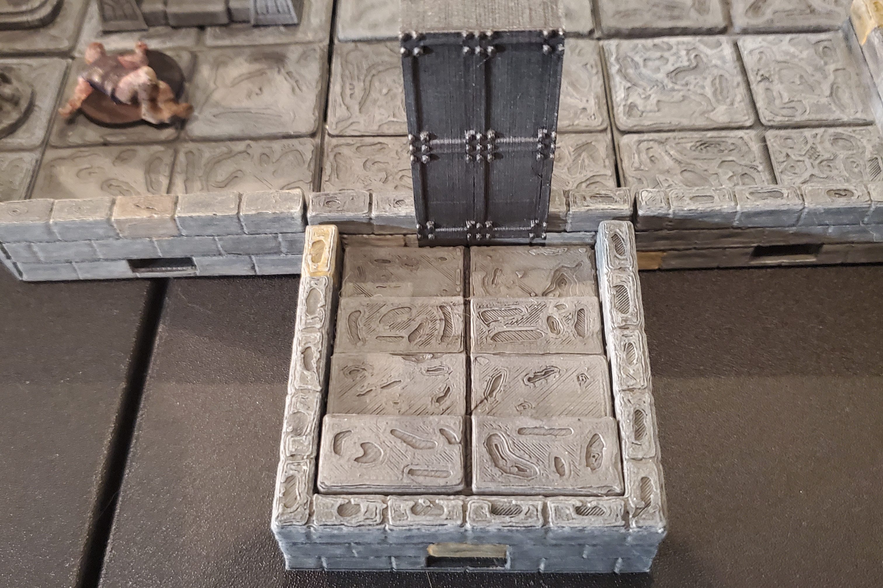 In the Northeast wall is a large metal door with no handles. There are a series of runes and markings on the door. There are 4 holes in the door that match up with the 4 puzzle pieces that the players have found. The pieces need to be placed into the door in the correct order. Otherwise, a blade extends from the North wall, attacking the player that is inserting the piece into the wall. The blade resets after the attack.