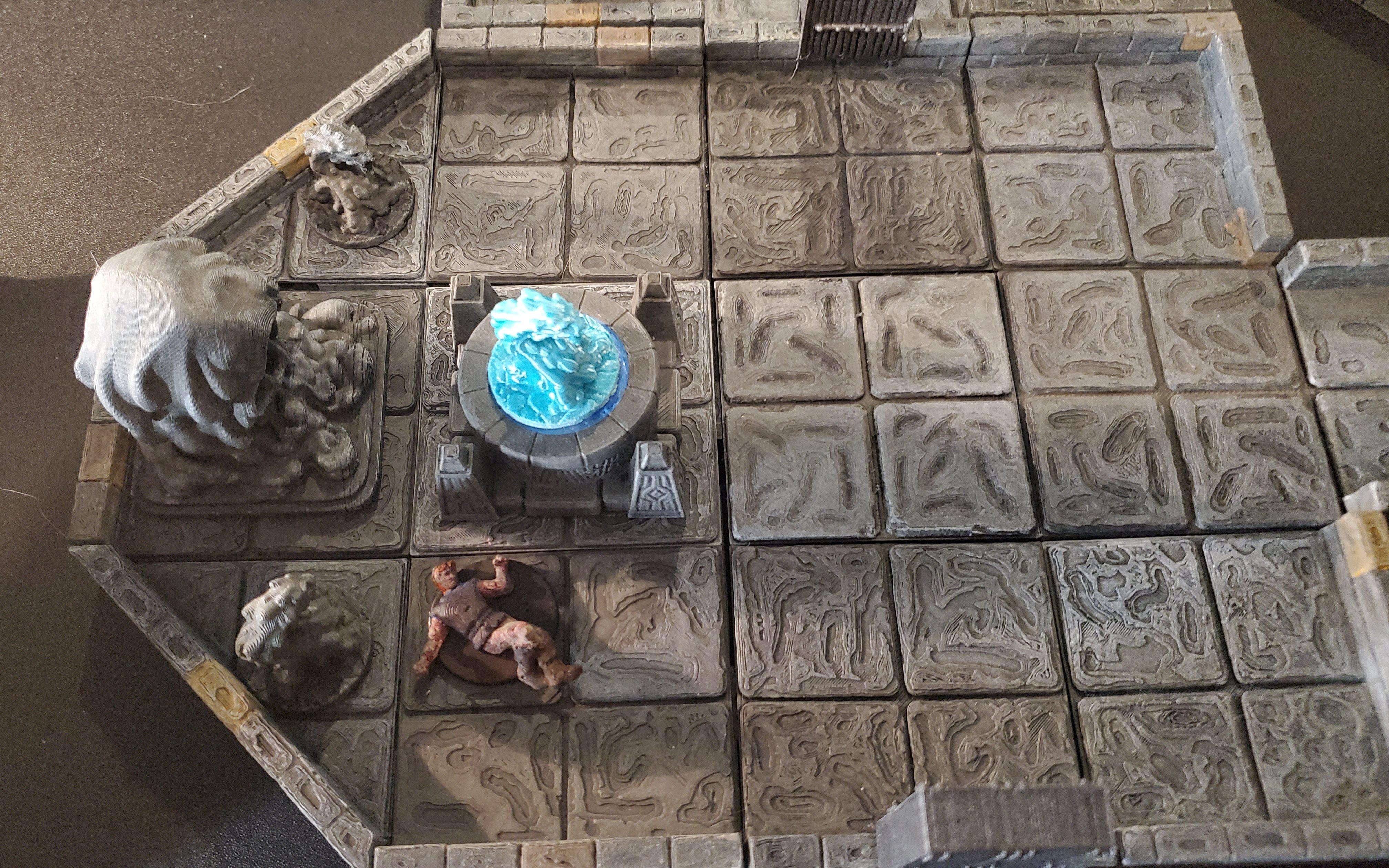 Just to the East of the statues is an ornate well that is filled with water. At the bottom of the well are a triangle blue metal puzzle piece and a torch. Just South of the well is the body of Richard, one of the brothers. If checked, his clothes are wet. If the players roll a Medicine check over 15, they can tell that Richard died from drowning. If the water is disturbed, a lesser water elemental attacks. There is a wooden door to the North (not locked) and an open passage to the East.