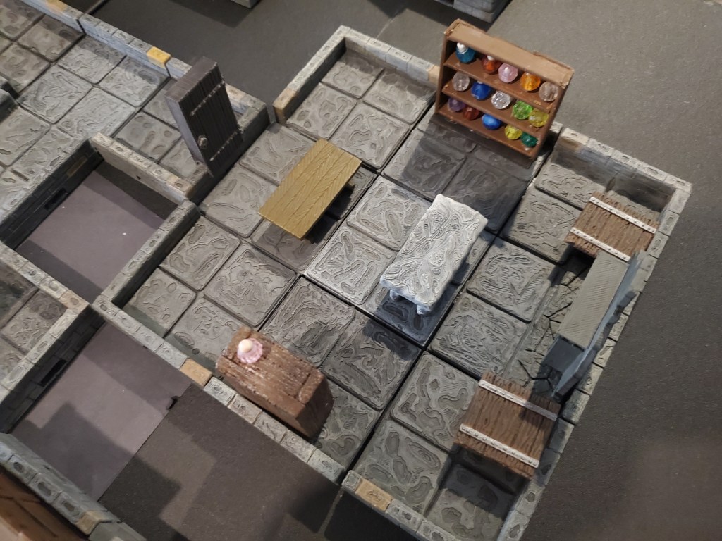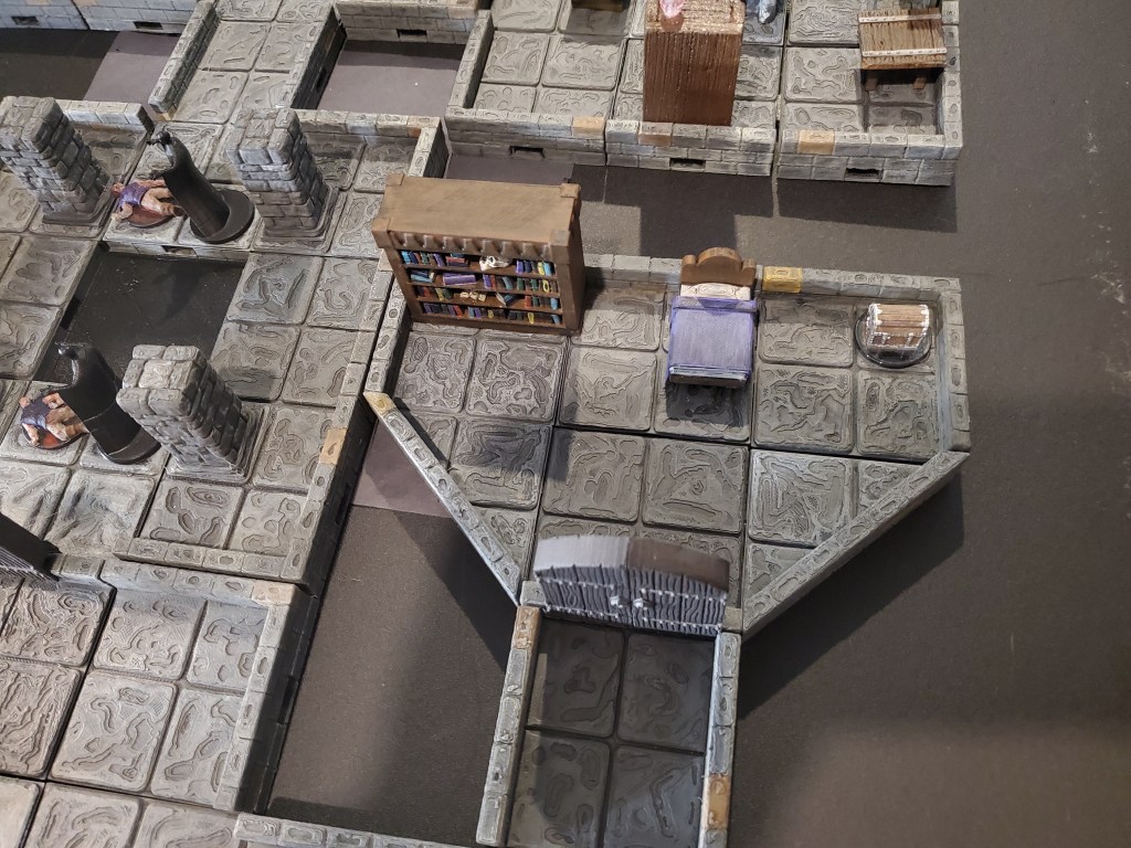 Here is a fly-over of my take of the Warlock’s Abode. As you can see, I got it to fit on a 3′ x 3′ table so it should be playable on a table at a convention. I can always shuffle rooms to keep them to the point of playable no matter the table size. Below is the one-page map with notes that I would use to run the game.
