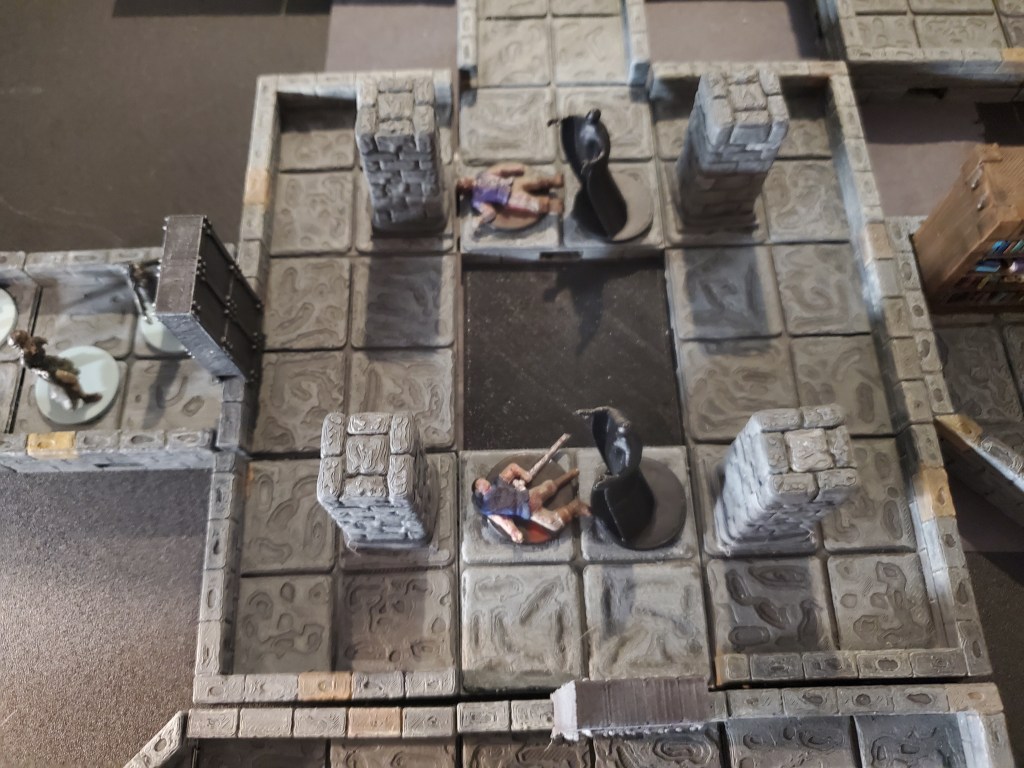 Room #5 – This room contains a deep pit in the center. North of the pit lies the body of William and South of the pit is the body of Richard. Both bodies look withered. The pit is about 30ft down before it ends in magical darkness. Inside of the pit is a blue metal hexagonal puzzle piece and two (2) shadows. The shadows will wait for the party to open the door to Room #4 before they attack. Otherwise, they will attack anyone that ventures into the darkness of the pit to protect the puzzle piece. There is a metal door on the West wall to Room #4 and an open passage to the North.
