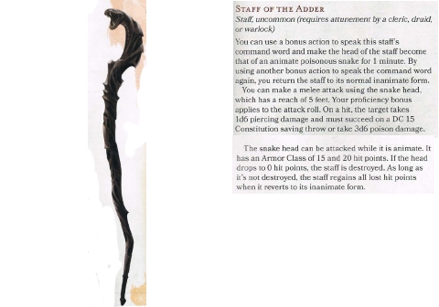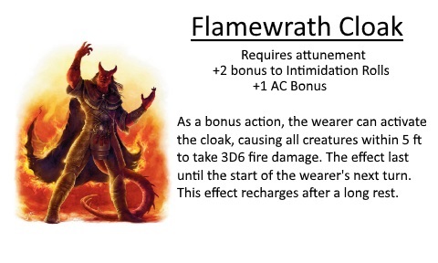When the ghost is defeated, the secret door behind the coffin will swing open to reveal the chest. Inside there are 5,000gp, a Staff of the Adder, and a Firewrath Cloak. I have 3″x5″ cards with the magic items printed on them that I can hand out. The cloak was a gift from Themberchaud the Red Dragon from the Out of the Abyss adventure. Since Sisava the Warlock and her party helped him, he had special magic items (all fire-based) custom-made for the party. I got the idea for the item from 4th edition. Since you had to have magical items at higher levels, there were so many different types with descriptions. I like to pull the names and basic function from 4E and use it for my “new” item.