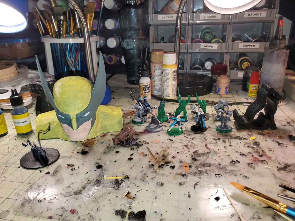 Wolverine joins the table. The flesh color and the white eyes look good but that yellow isn’t covering the way I would like. I have put 3 coats on over a grey primer but it doesn’t look right. I might have to try a different yellow (enamel?). After the yellow is done, I can go back and do the black parts (still just the grey primer).