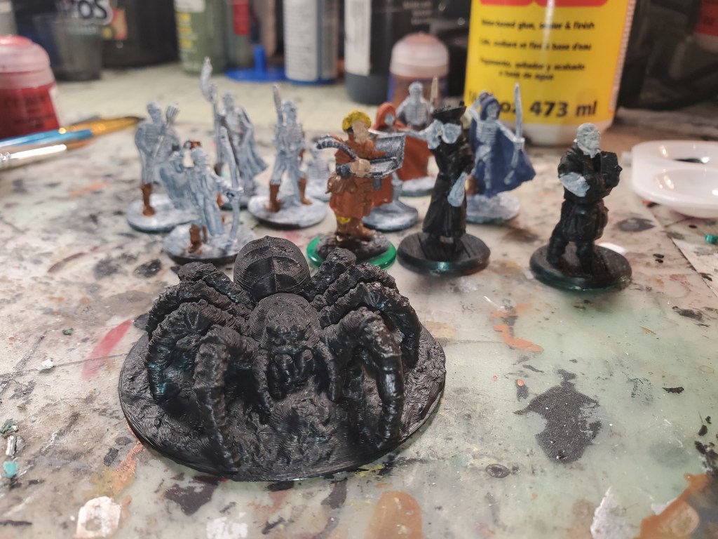 There are a lot of skeletons from Fat Dragon Games. They are all supportless (which I prefer) and have a lot of different poses. The wizard/scribe from the Bones 5 Kickstarter got some more colors on him this past week. He should be finished this week. I also printed out the butcher and grocer from Fat Dragon Games along with the giant spider.