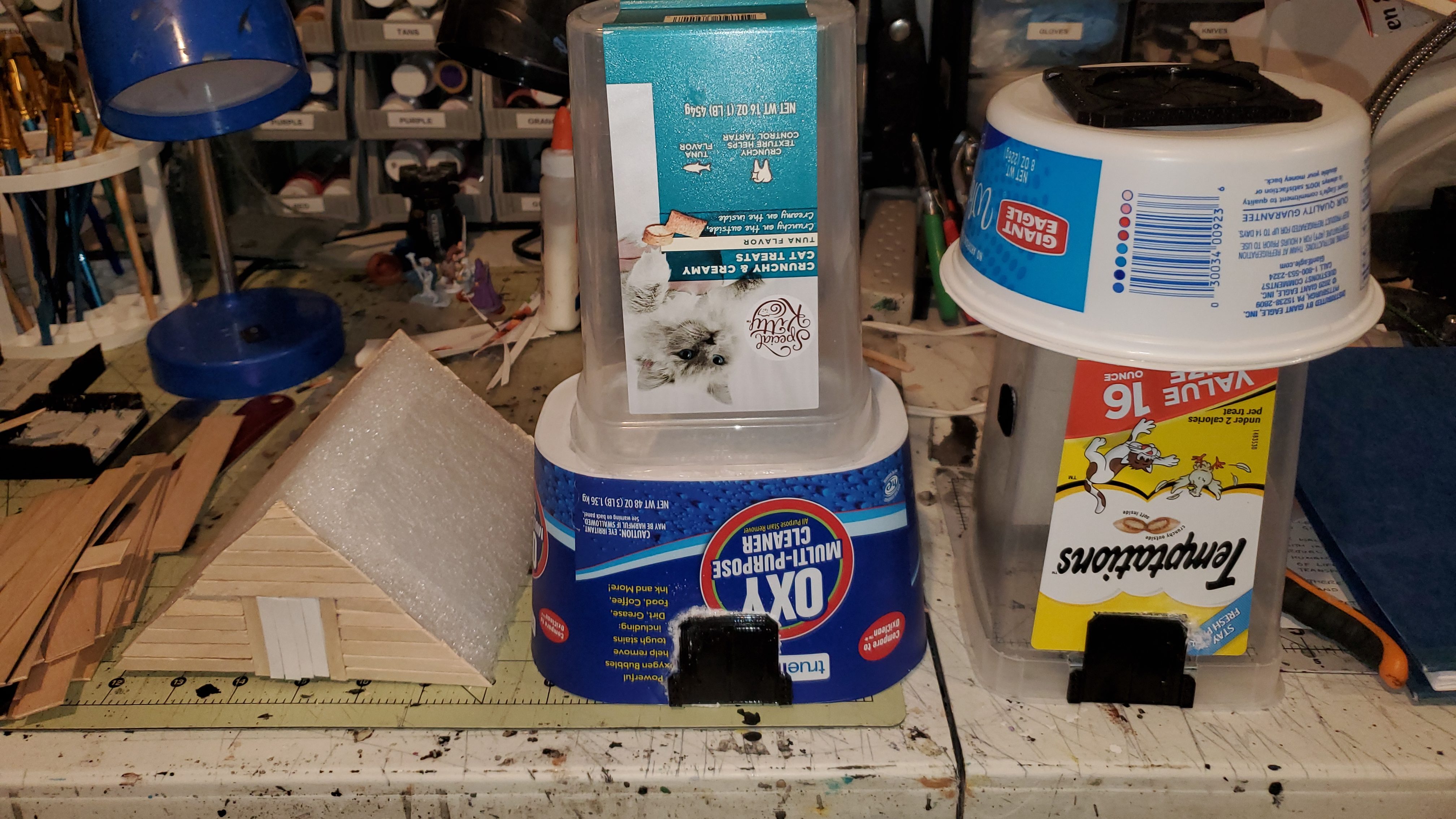 A few new scratch-built buildings are in progress. I started a small wooden cabin that is using foam as a structure. I have popsicle sticks on the front and back so far. Going to put larger sticks on the roof this week. The door is cardstock. The other two buildings are going to be sci-fi terrain for my 5 Parsecs from Home game. I still need to add more greebles to them but I go doors added so far. Some straws for power conduits and other parts then they will be ready for primer.