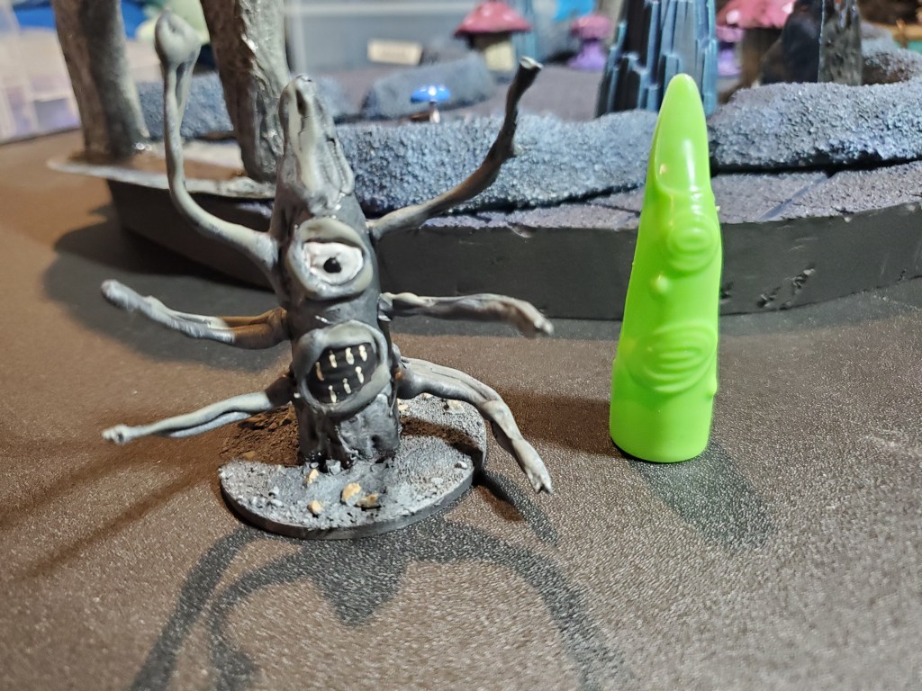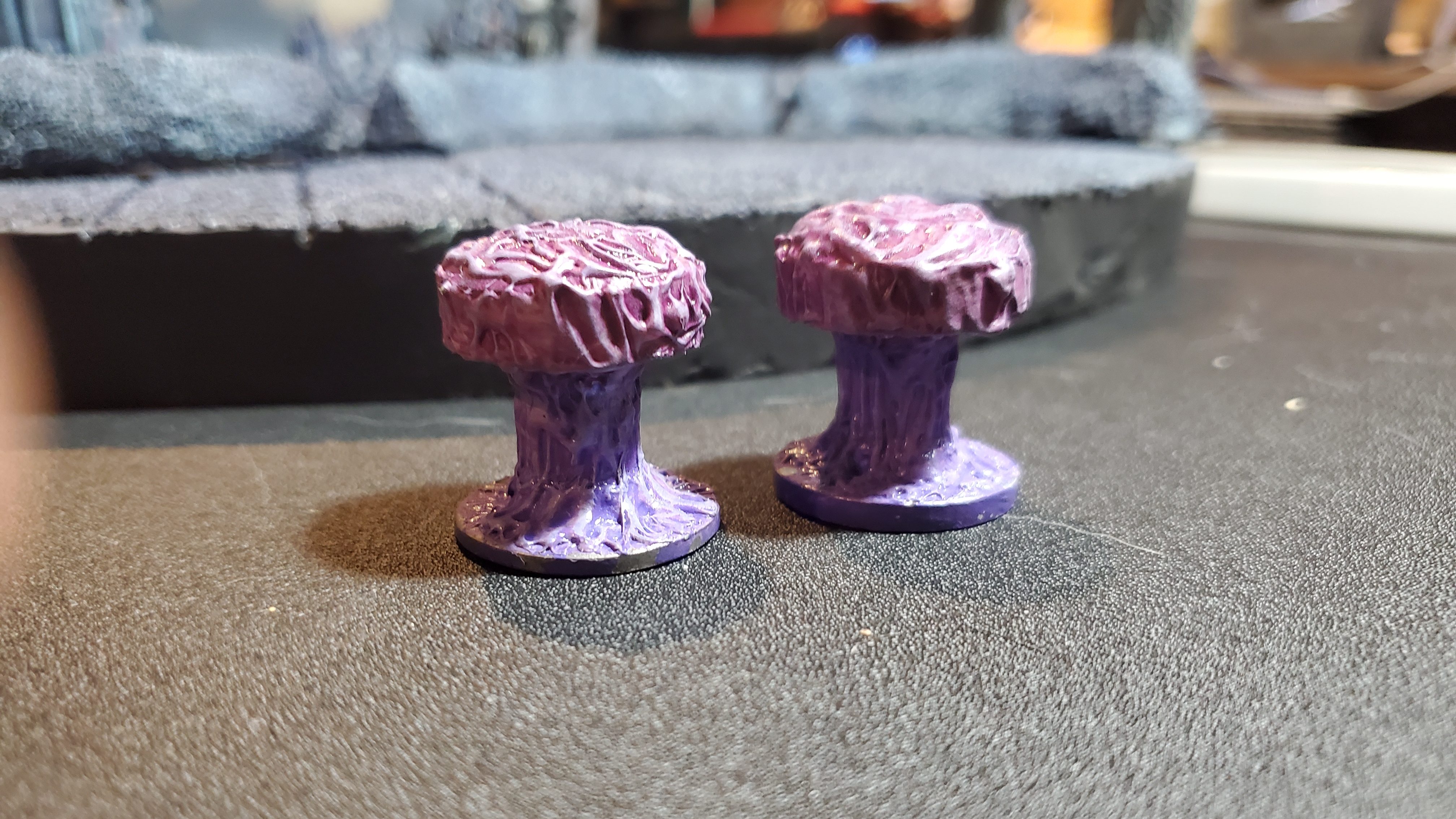 The violet fungus is made from a wooden dowel and wooden spacers. It was covered with hot glue to give it texture then painted purples and pinks to go with the Underdark theme.