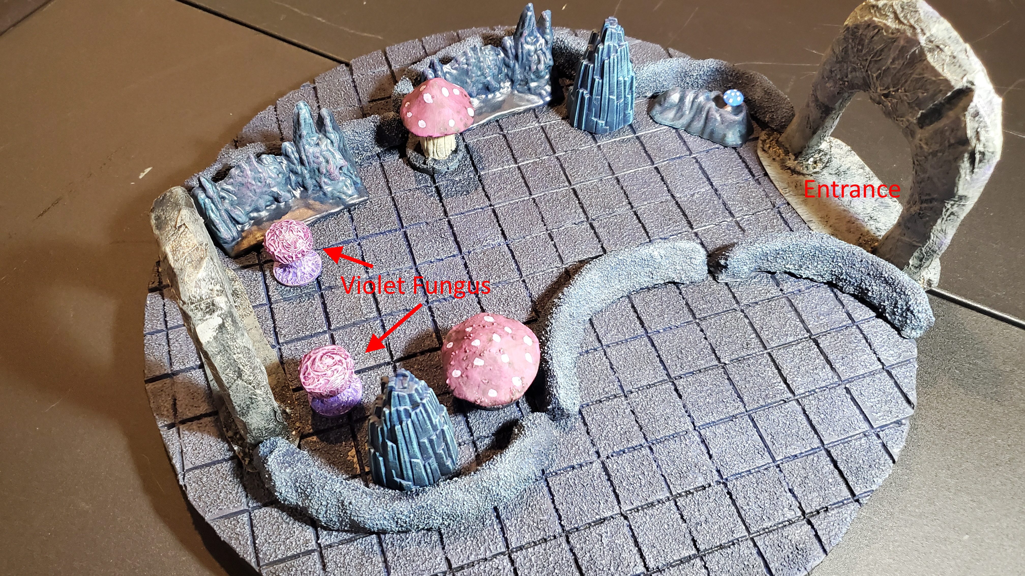 As the group moves through the winding tunnels of the Underdark, they find a small section of the tunnel that opens up a bit. I would describe the cave as having a few big mushrooms spaced throughout the cave and the skeletal remains of a creature near the exit of the cave. As the party moves toward the exit to investigate, the two fungi near the exit attack. The fungus is Violet Fungus and will attack the closest creatures to the entrance (within 10ft since that is the range of their attacks). Now, I would place the UDT with the scatter terrain on it on the table. Allow the PCs to place their miniatures on the UDT anywhere they would like to be, except the PC that entered into the 10ft range of the Violet Fungus. They have to place their miniature somewhere within that range. Have the party roll initiative while you roll initiative for the Violet Fungus and the surprize monster. I would give the highest initiative roll to the violet fungus and save the lower roll for the other monster.