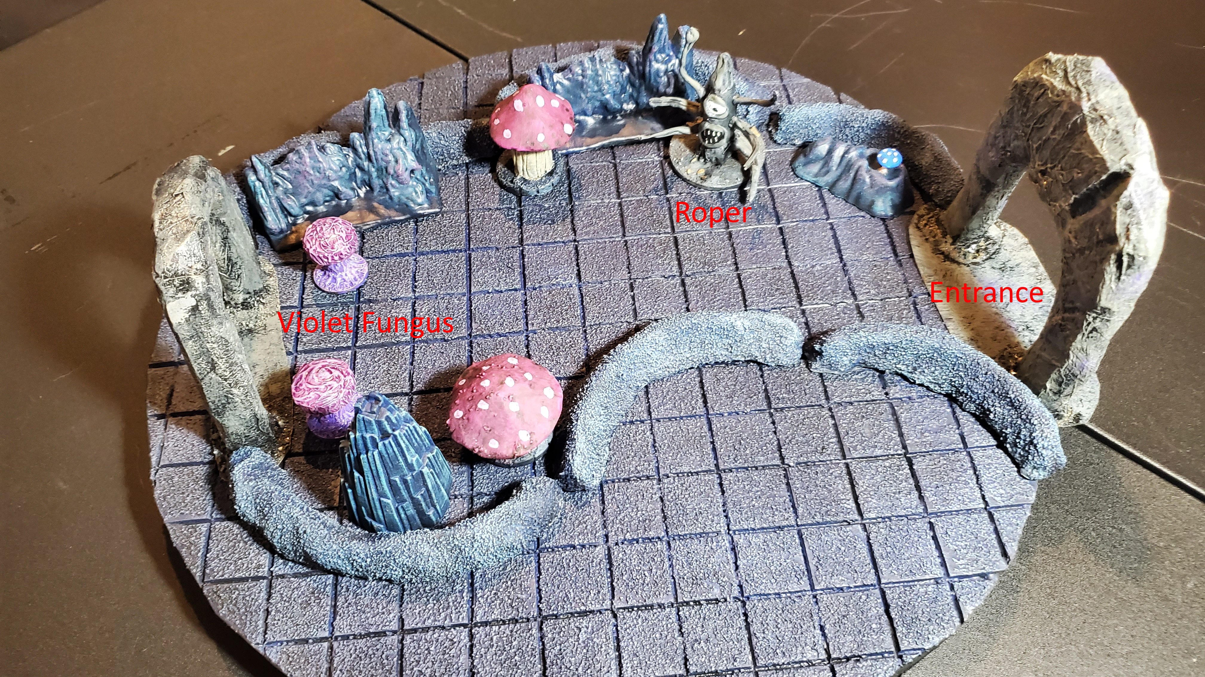 At the start of the combat, roll a d4 as a timer die and place it on the side of the UDT as a countdown. As the violet fungus begins the attack, have any PCs near the entrance of the cave make Preception checks (DC 25) to see the Roper move and attack the party. The roper should be a surprise to the party and will hopefully be near the back of the group near the party members that are trying to stay out of melee.