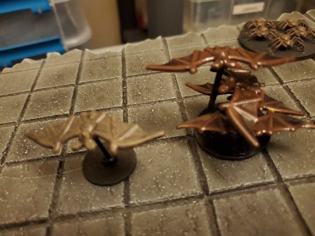 Using the bat rings, I made a giant bat and a swarm of giant bats. The stands are just 1″ round wooden circles with holes drilled into them. I used toothpicks as the flight stands.