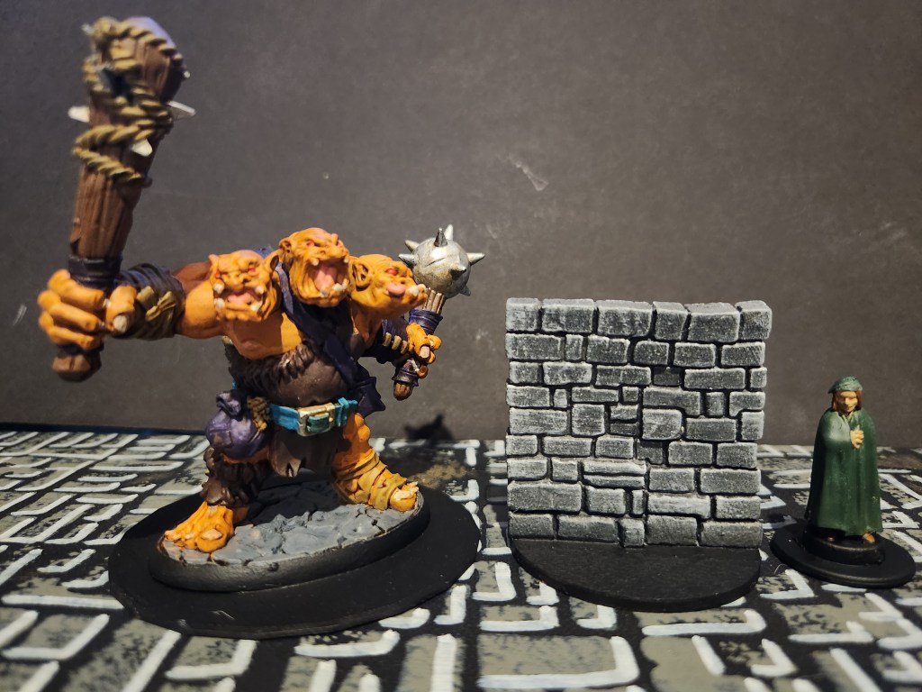 I believe that all three of these items are from the Bones 5 Kickstarter. There was the three-headed ogre, a brick wall, and another villager.