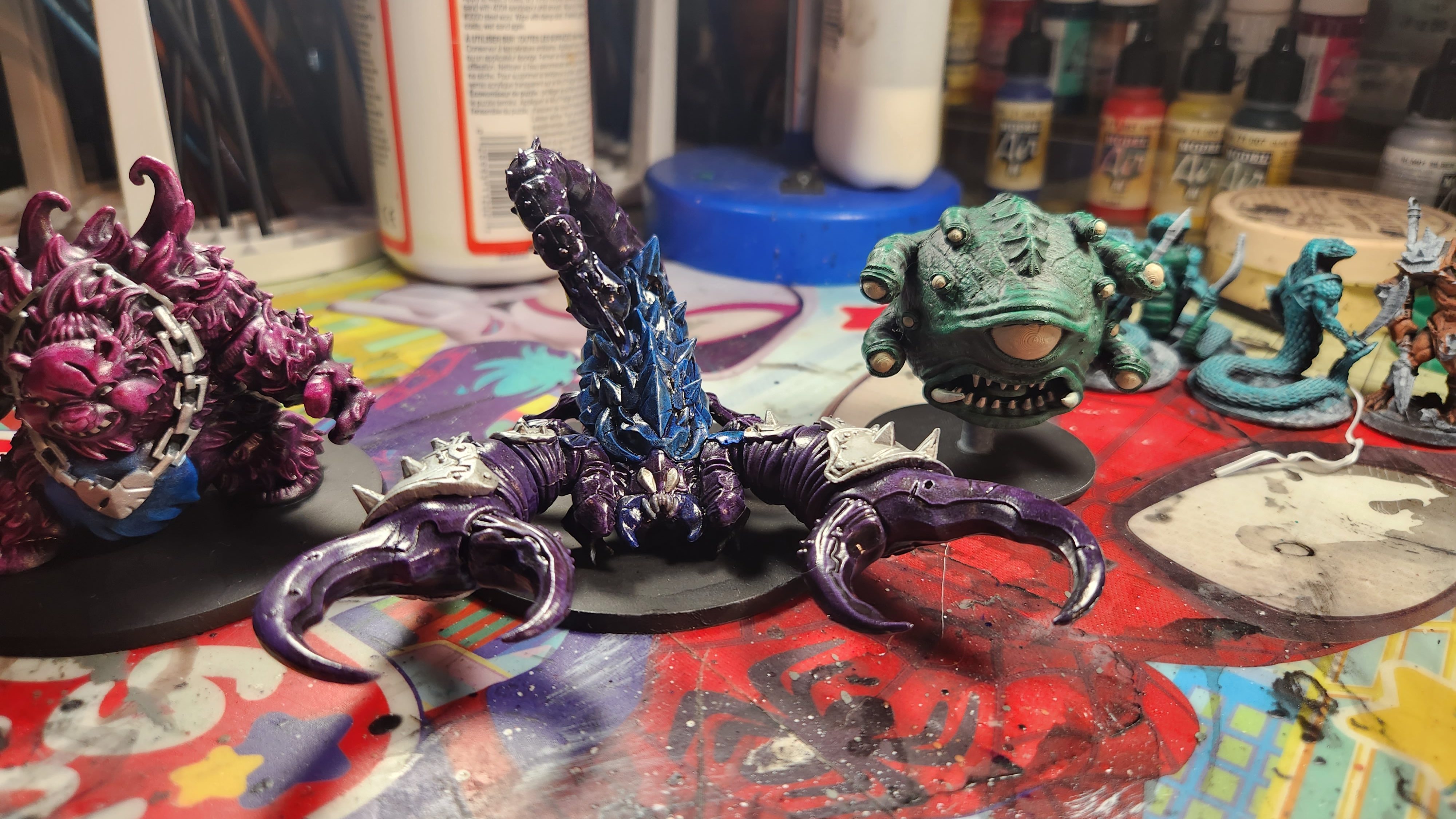 Here is where I was really getting excited. The scorpion (Bones 5 Kickstarter) and anger Care Bear (Massive Darkness 2) both turned out really nice in my opinion. I had both of them done in less than an hour. All of the colors on the scorpion and bear are Dr. Ph Martin Bombay inks except the silver, which is just a standard miniatures paint. They just need a little touch-up and clear coat and they are done!