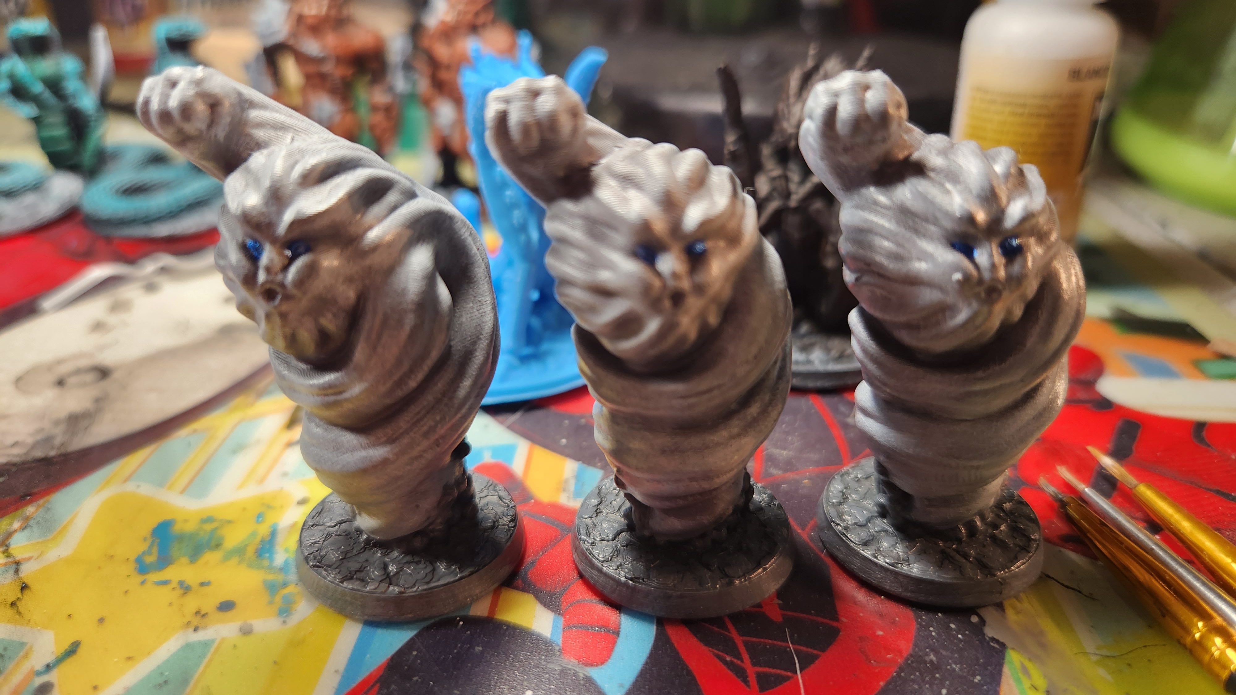 I started with some air elementals (Brite Minis). Instead of the black primer, I used a grey primer and skipped the grey dry brush, and just used white. They went quickly but it was not exactly the ‘Slapchop’ method. So I moved on to more miniatures.