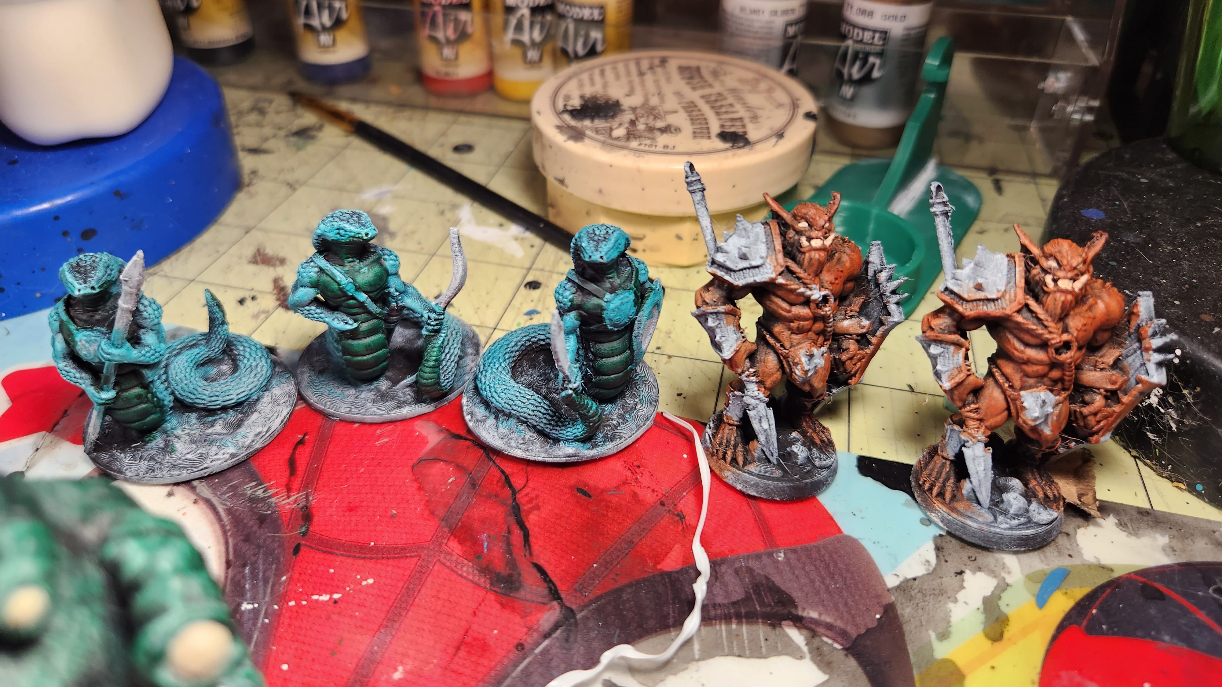 I grabbed some of the snake men (Fat Dragon Games) that I like as well as bugbears (Lost Adventures). Primed black, dry brushed both colors and applied the base speed paints. Not too bad looking for this stage in the process. I also grabbed an Angry Ball of Eyes (Fat Dragon Games) and painted it up with speed paints (I also had to do the eyes and teeth since that would give me a clear picture of the final result). I was starting to see the appeal of Slapchop. I wanted to see what it would look like if I used acrylic inks instead of speed paints.