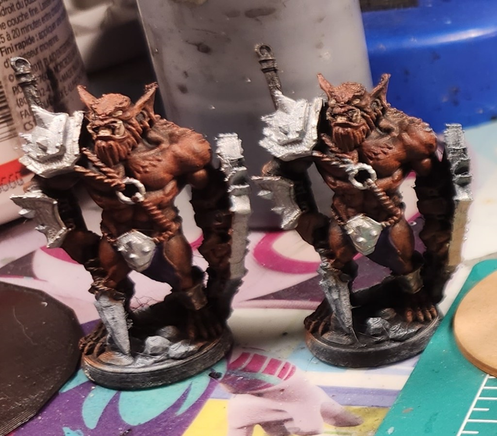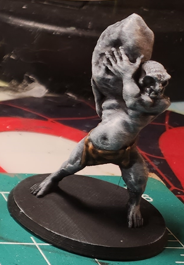 - I have an ogre with a rock primed and highlighted. I painted his loincloth a brown color. Not sure what color to do the skin. Should be completed this week.
