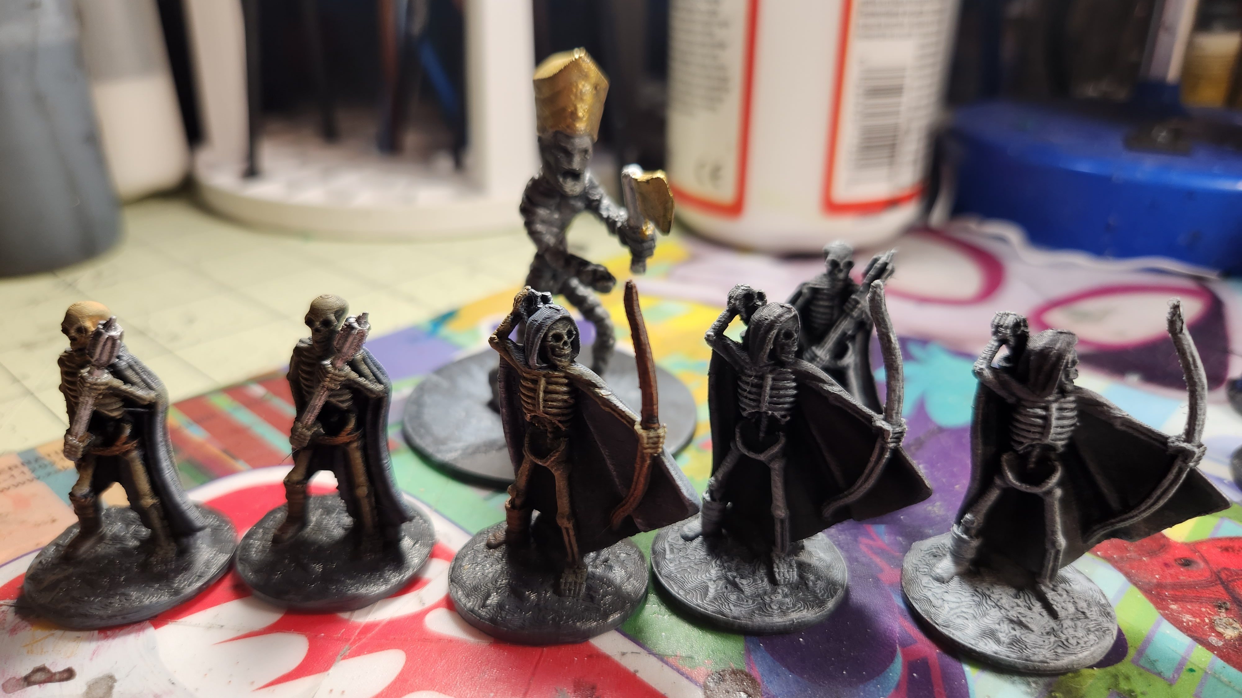 I have another group of undead on the table. I was thinking of making a Mummified Undead army for Age of Fantasy Skirmish. I need a Mummy Lord so I took a Dollar General Mummy from a pack of 10, cut off his head, and added a head that I 3D-printed. In front of him are more general skeleton soldiers and archers (Fat Dragon Games I believe). I think these might make it onto the army list as well.