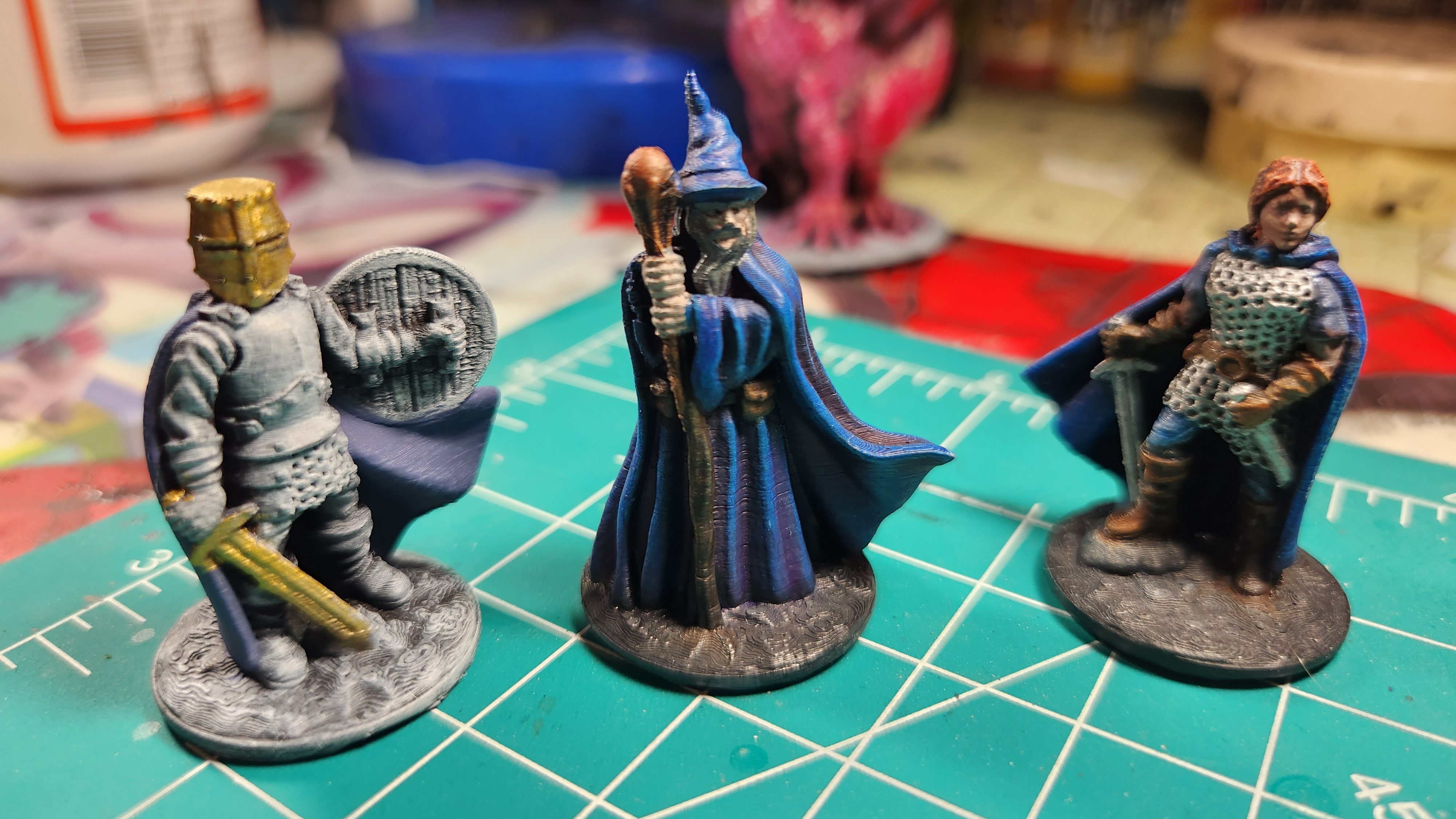 More random adventurers for the table. The wizard and the female warrior are almost done, the knight just has a few colors on him.
