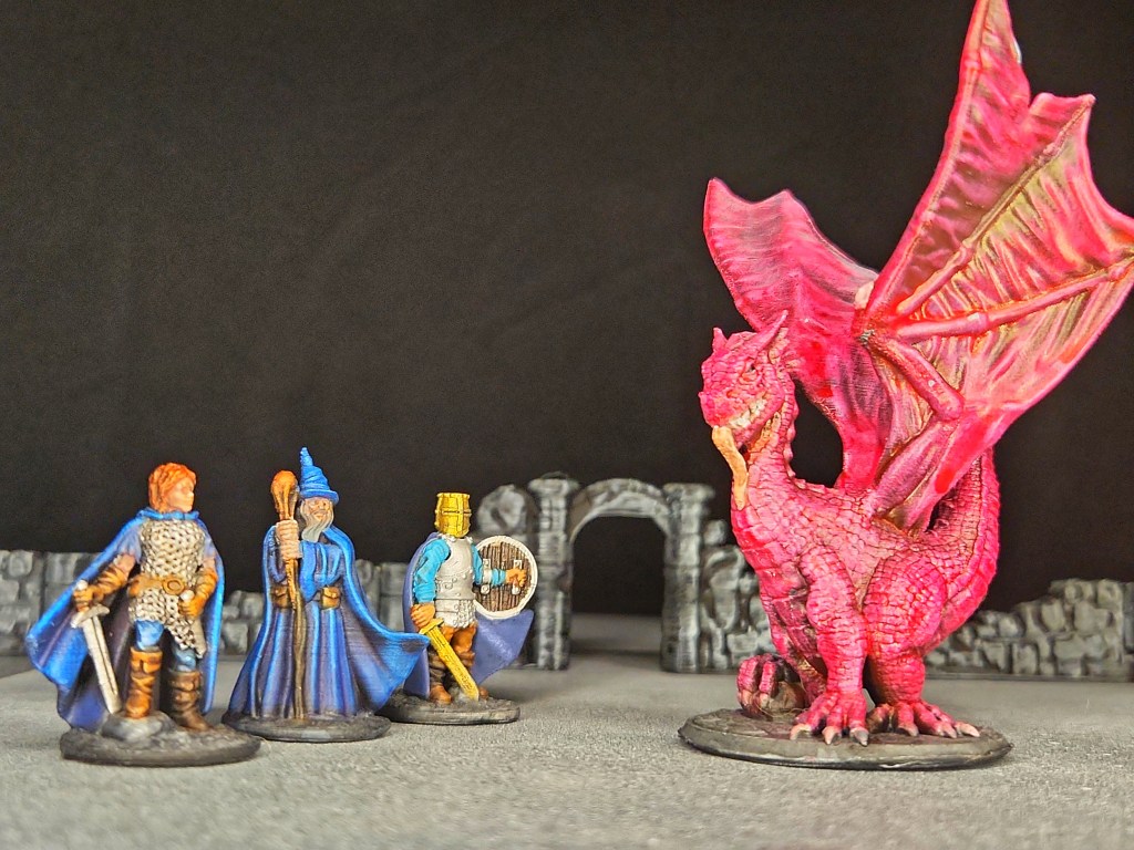 I finished a young dragon (Brite Minis) along with a female fighter, a wizard, and a male fighter (Fat Dragon Games Adventurer Set). All were primed and highlighted using the Slapchop method.