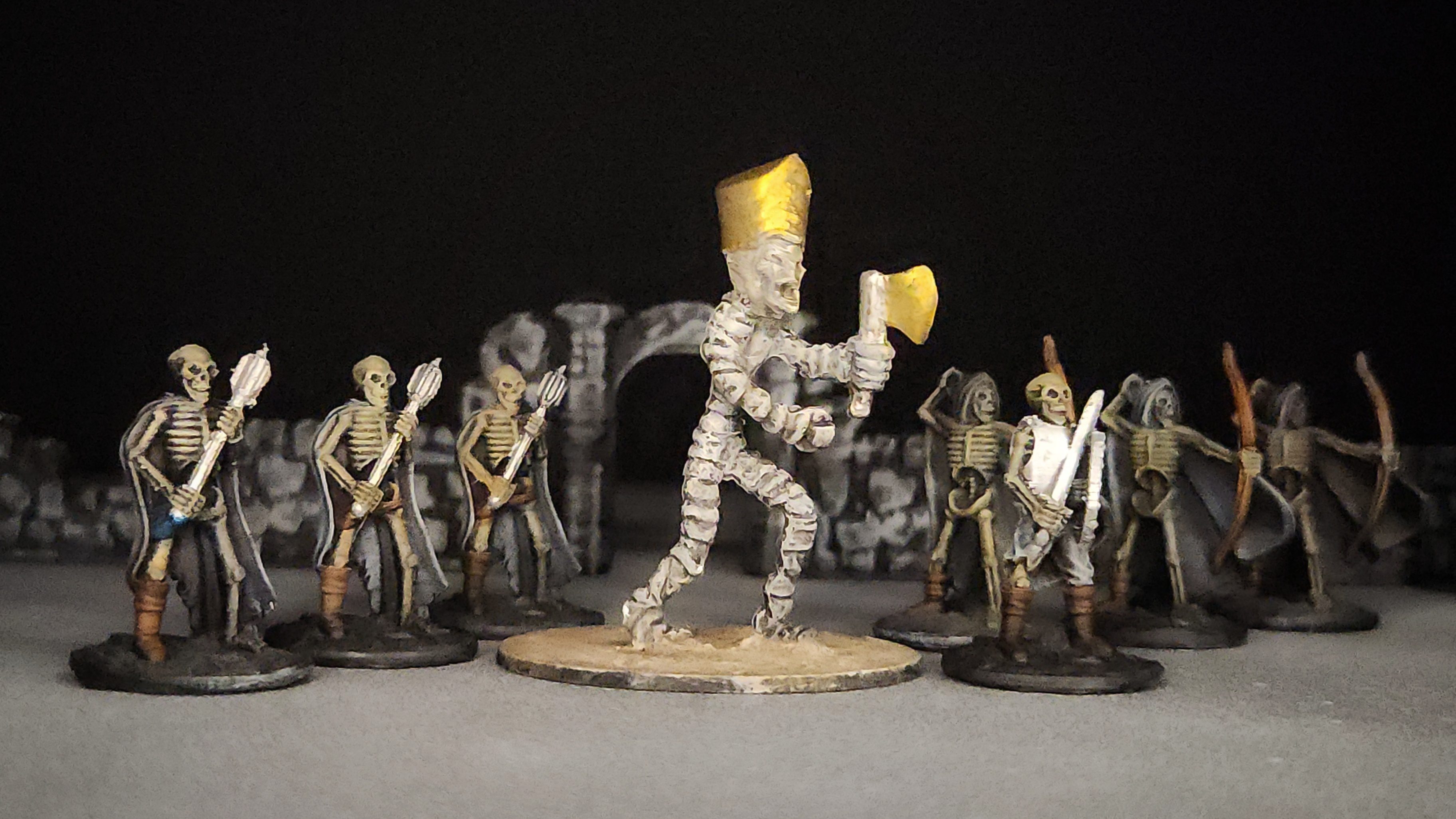 Here is the mummy lord for my AoFS Mummified Undead army. He is ok (I spent roughly $0.15 for him). I might go back and work on his head a little more. It could use more color (maybe give him red eyes or something) and more wash to reveal the details of the face. All of the skeletons are from Fat Dragon Games.