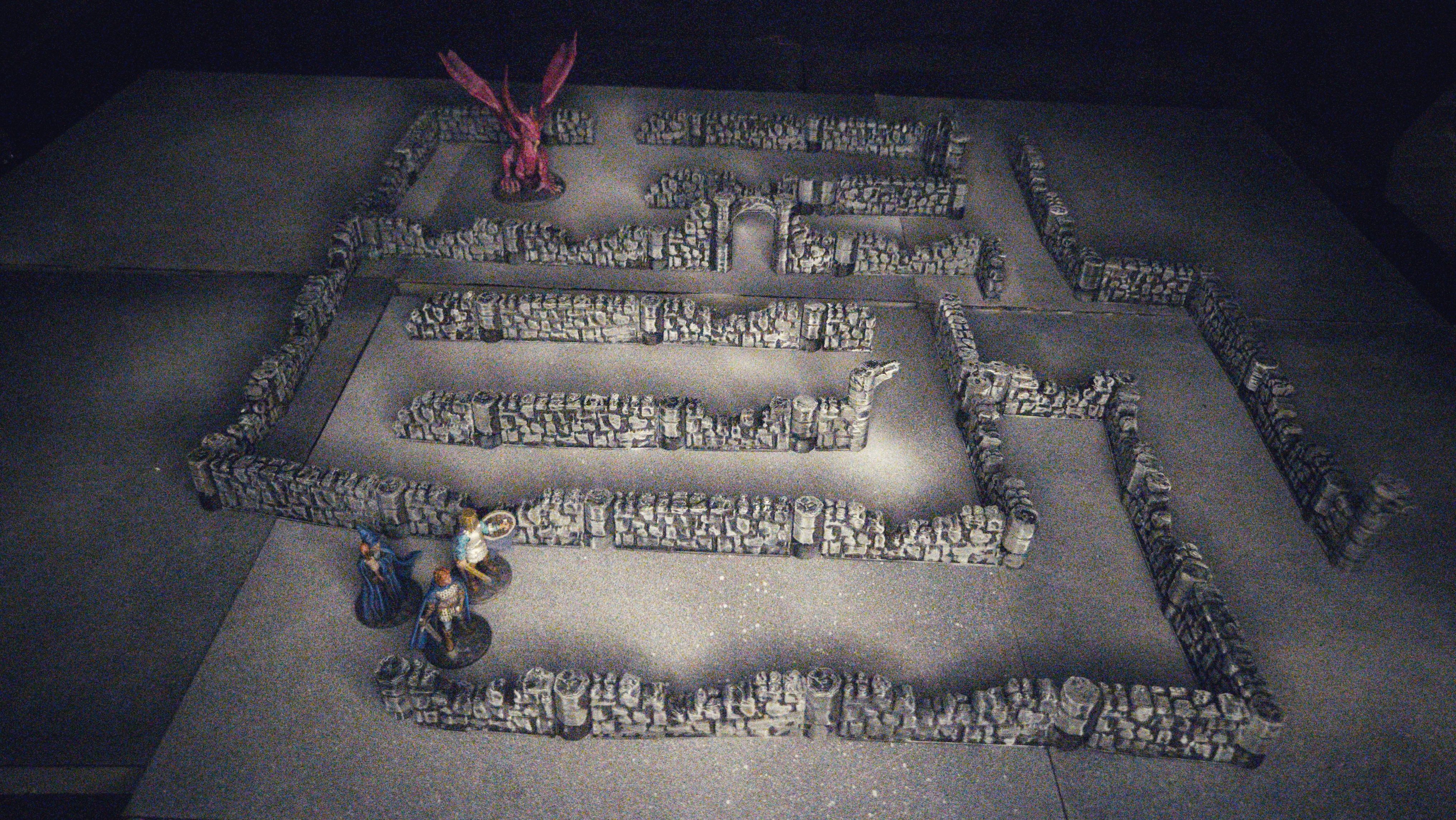 I have been printing DungeonStick Ruin walls whenever I get close to the end of a roll of filament. I finally sat down and painted them. There was more than I remember printing. I put together a small dungeon maze for our heroes using all of the wall pieces that I had (there were some couplers left in the box too).