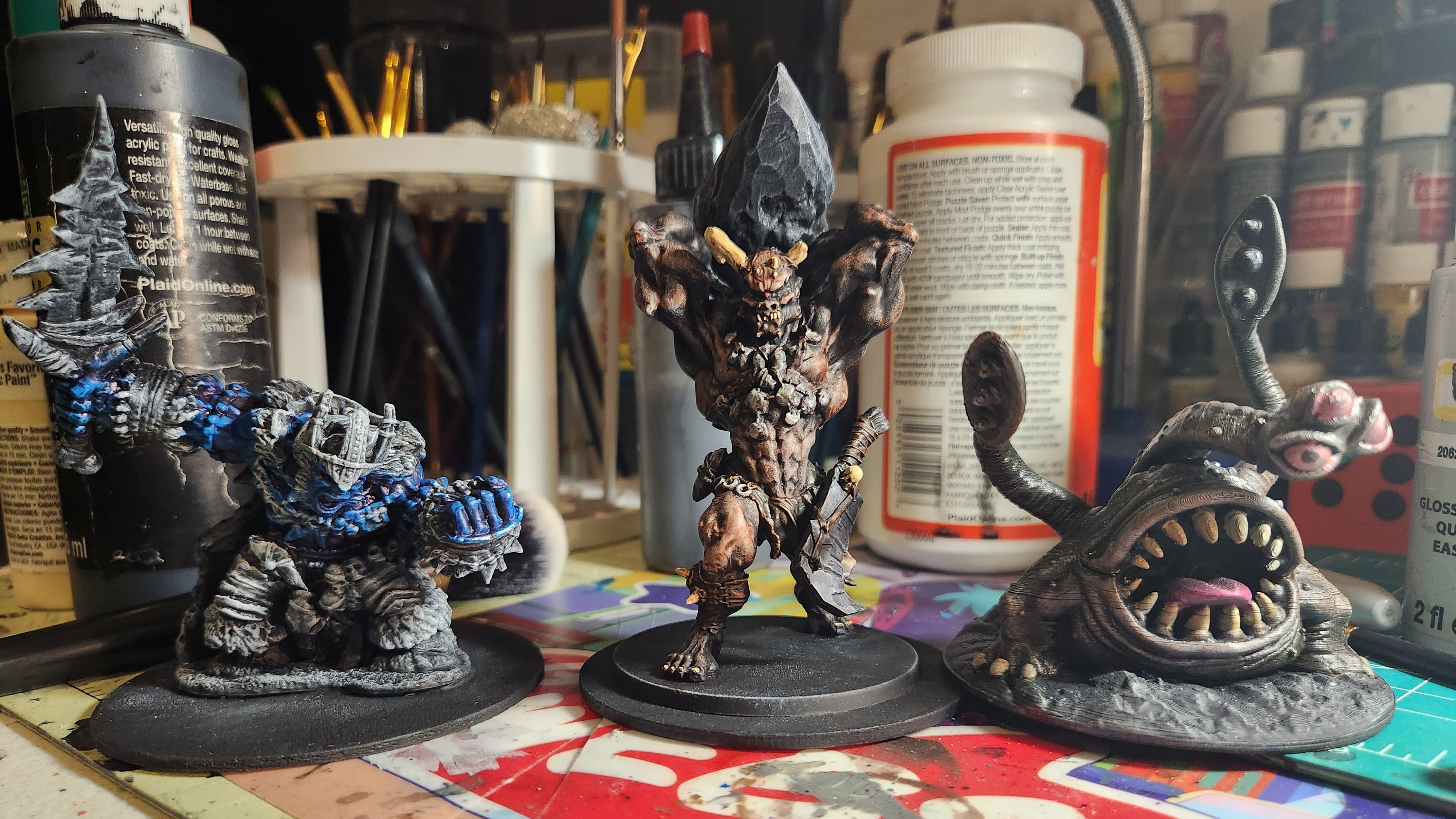 The miniature in the middle is a Cliffbreaker Cyclops from Massive Darkness. I have had this miniature for some time and finally decided to paint it up. I got the miniature primed, highlighted, and most of the colors on it so far. I might add some washes and highlights then call it done.