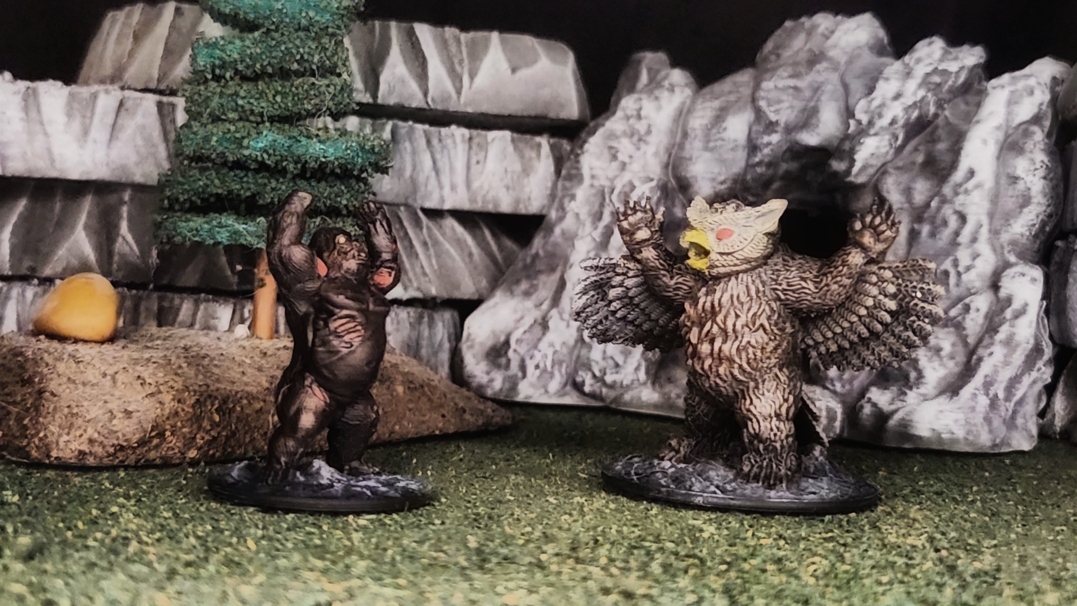 A zombie gorilla wanders too close to the cave of an owlbear (Both are from Fat Dragon Games).