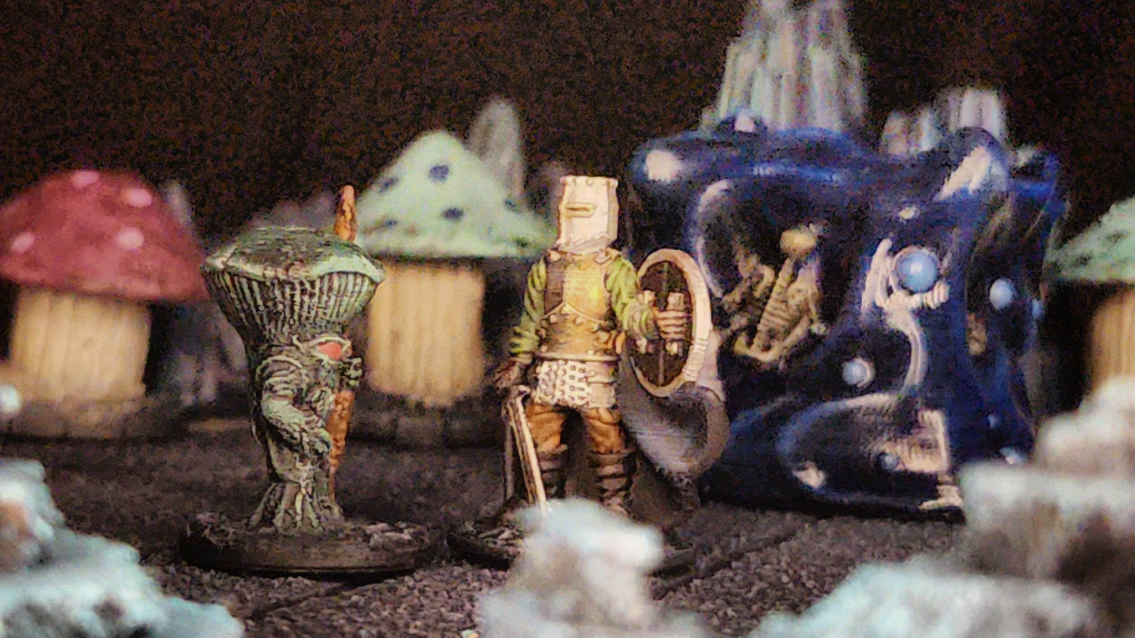As a mushroomfolk and a knight discuss matters in the Underdark, a cube-o-snot approaches the pair (All are from Fat Dragon Games). This could have been a better picture.