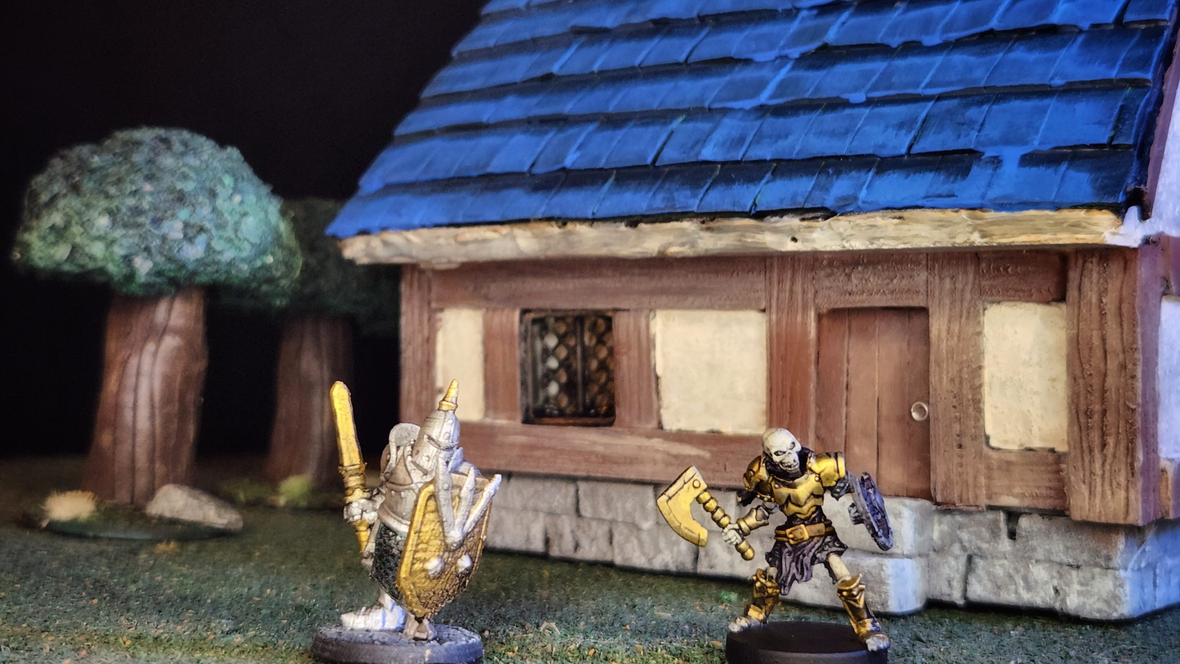 I made the house in the background this week from foam and 3D-printed windows. It isn’t the most remarkable building but it will look okay on the table. The trees I made before (foam, oatmeal, and air dry clay).