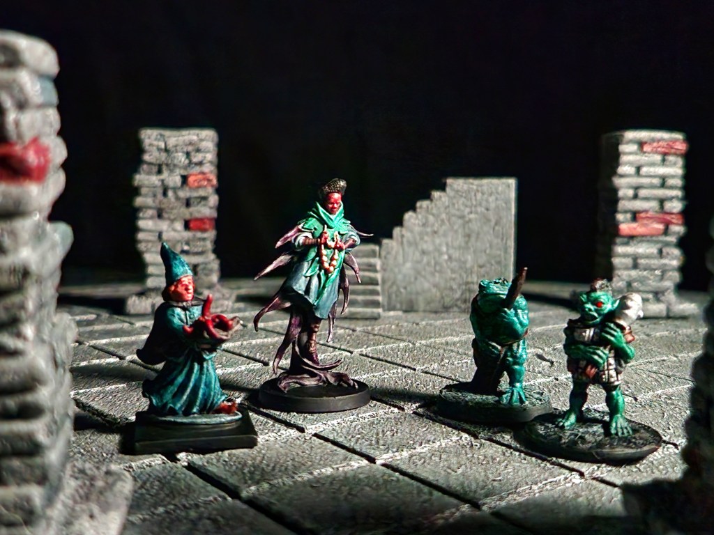 The wizard was from a 2016 Kickstarter (Midlam Miniatures) that I finally got around to painting. The monk is from Massive Darkness 2 (CMON). The frogfolk is from Brite Minis and the goblin is from Fat Dragon Games. The pillars are older (Black Magic Craft) and the stairs are from Dungeoncraft.
