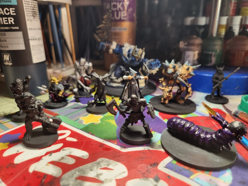 That frost giant is still lingering in the background. I really want it off the table, but I am determined to get it off by finishing it. I have a bunch of 3D-printed miniatures on the table with an assortment of miniatures from the Massive Darkness 2 board game. I also have some other game miniatures (like the giant Skeleton that was a HeroClix and a skeleton from Rune Wars), plus the caterpillar which is a children’s plastic piece.