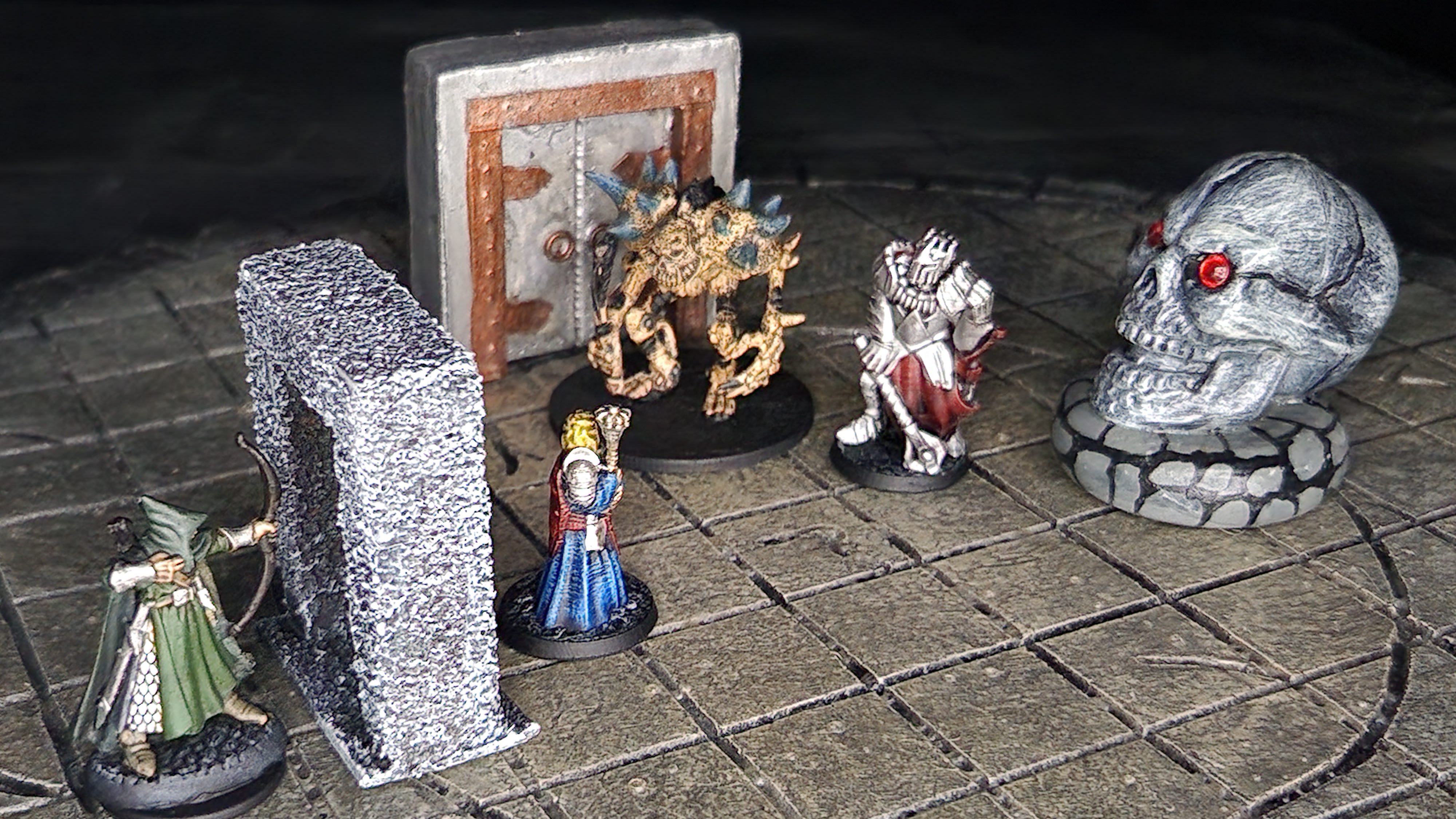 The ranger is from the Bones 5 Kickstarter, the cleric and dark warrior are from BriteMins, and the bone golem is a HeroClix that was rebased and the paint was touched-up.