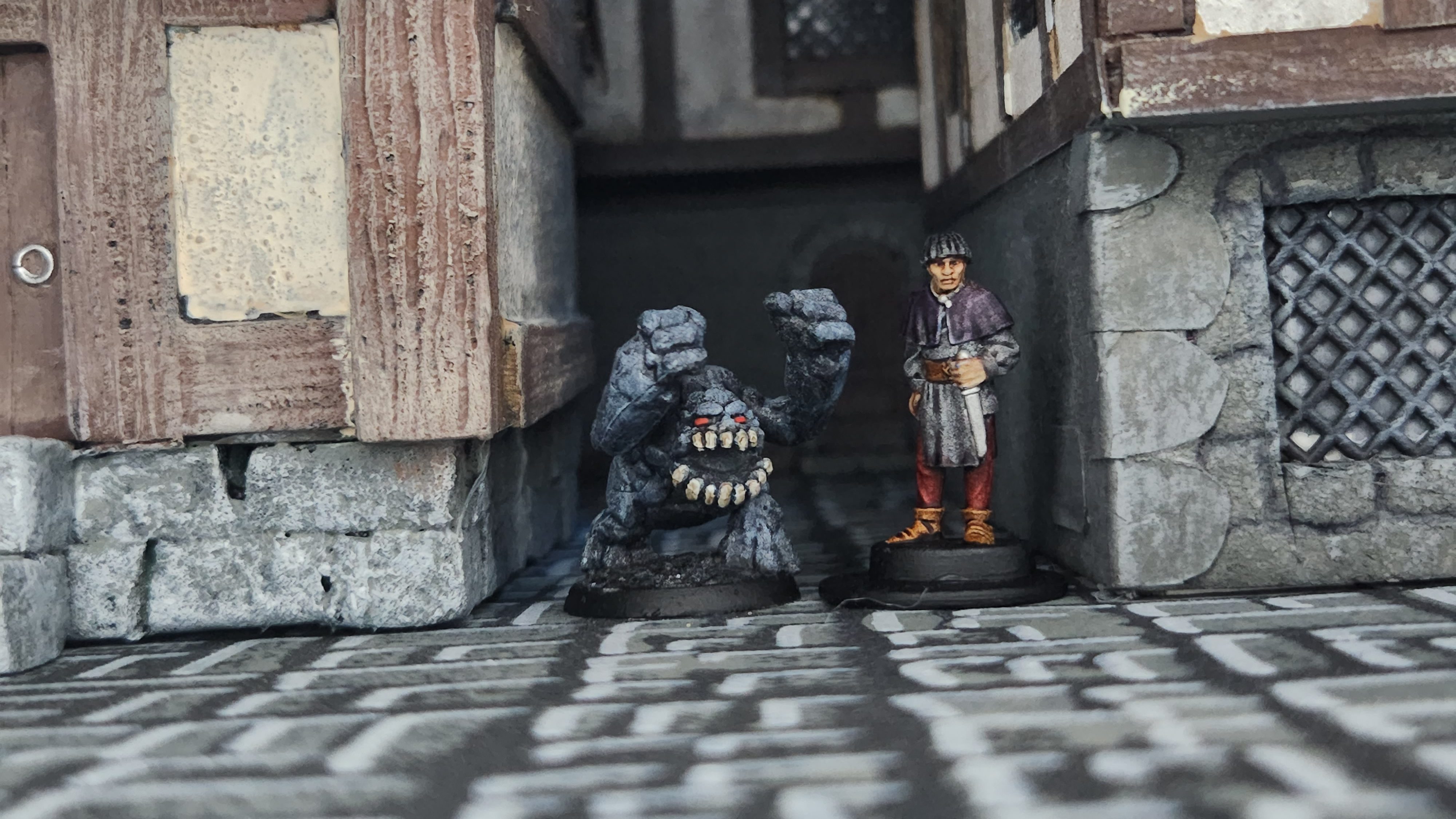 The man and the earth elemental are from the Bones 5 Kickstarter. The buildings are handmade.