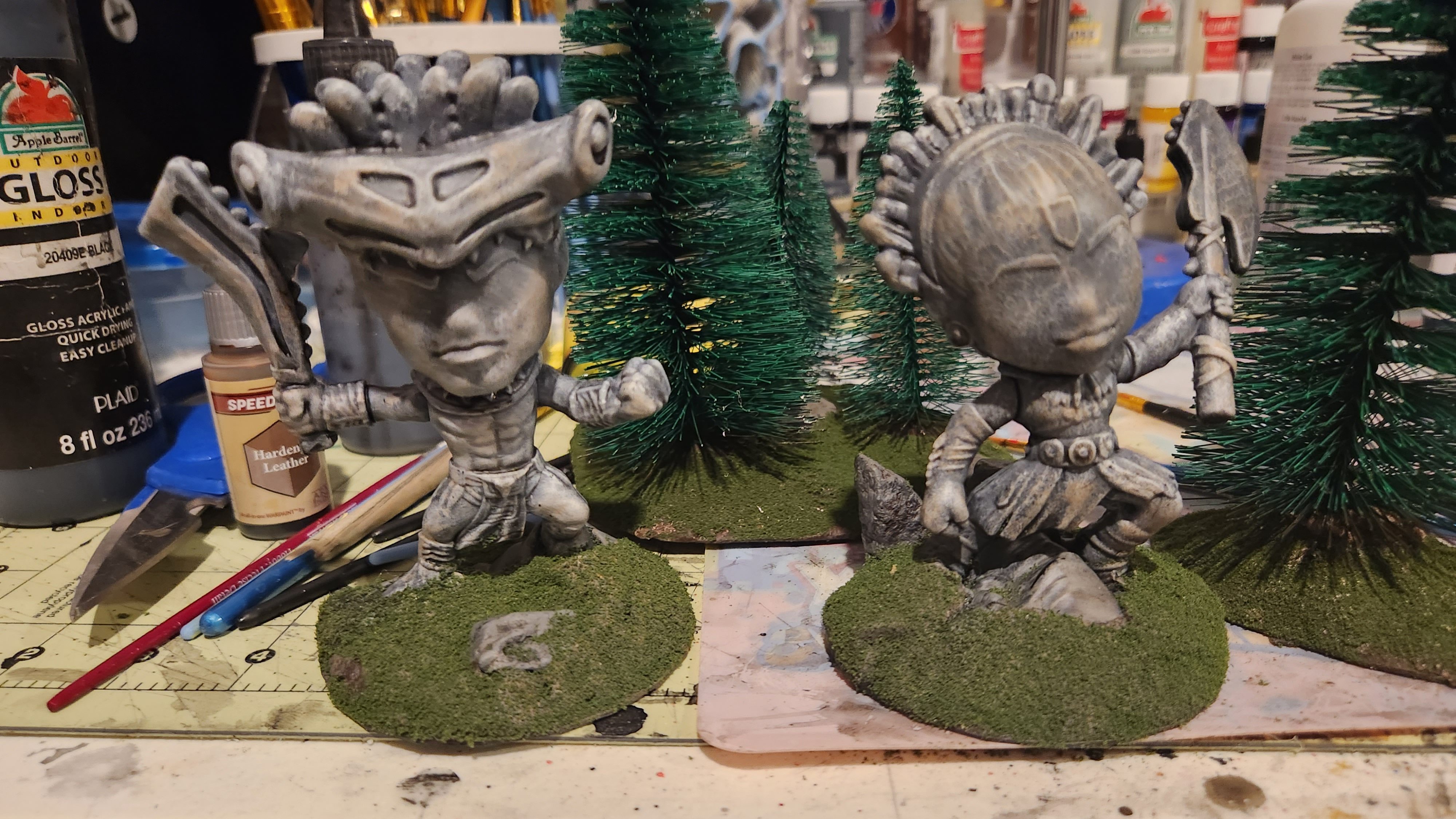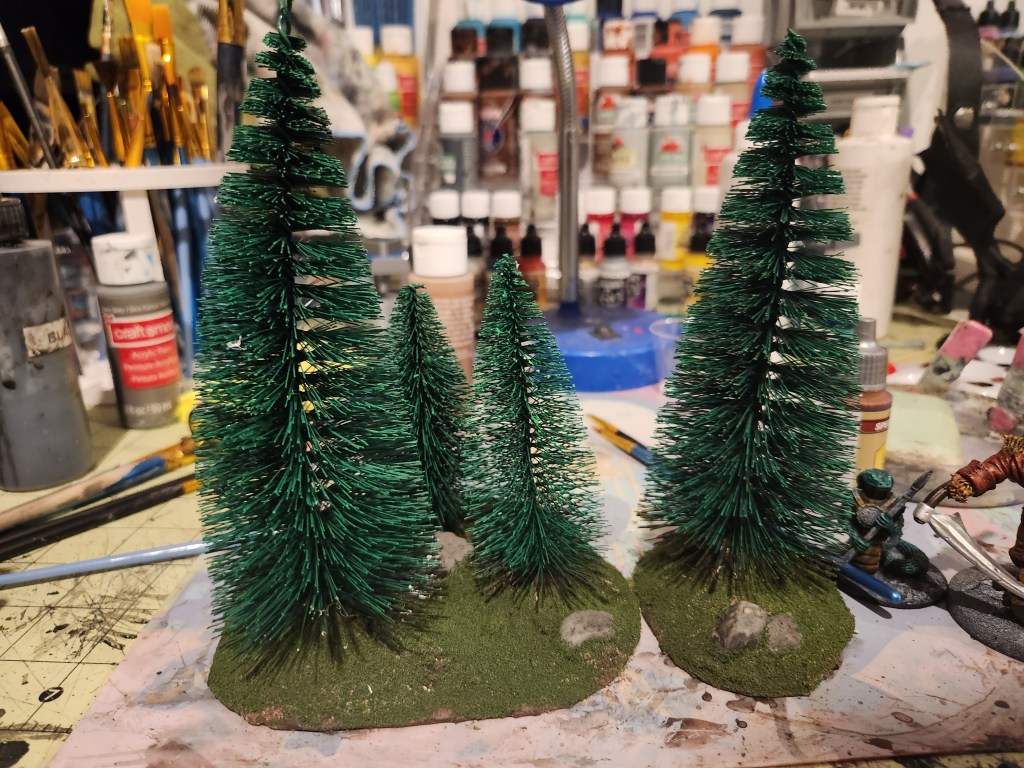 Christmas village trees that have been converted for tabletop terrain.