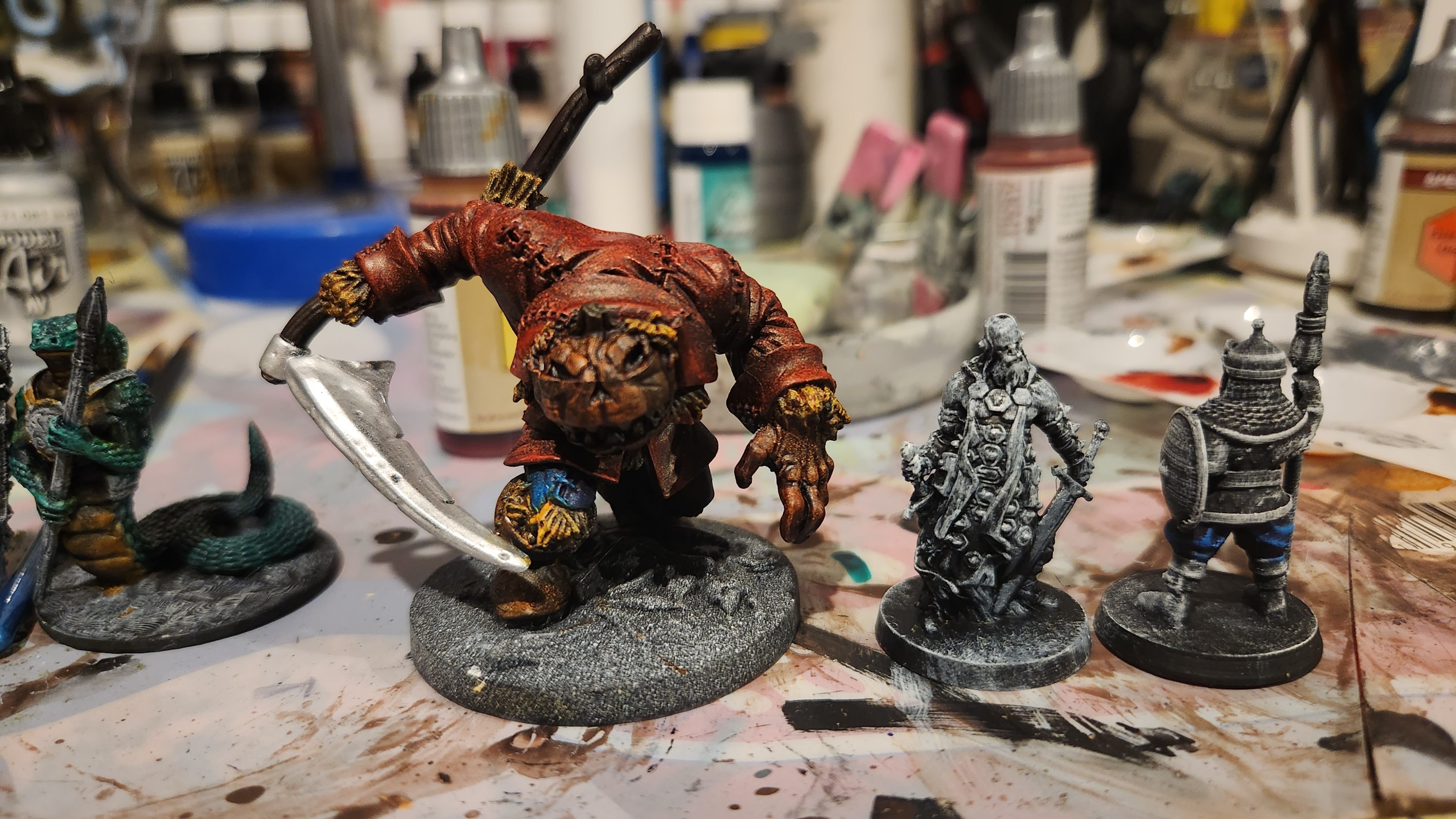 A scarecrow (Bones 5 Kickstarter), a barbarian (Massive Darkness), and a human warrior (BriteMinis).