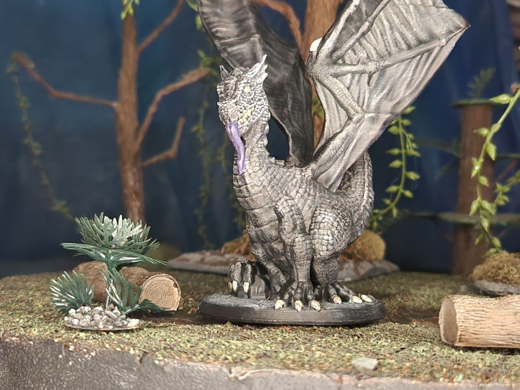This miniature is from BriteMinis. The eyes are a bright green but don’t show up well in the picture. I sized it 150% from the original model to make it an adult dragon.