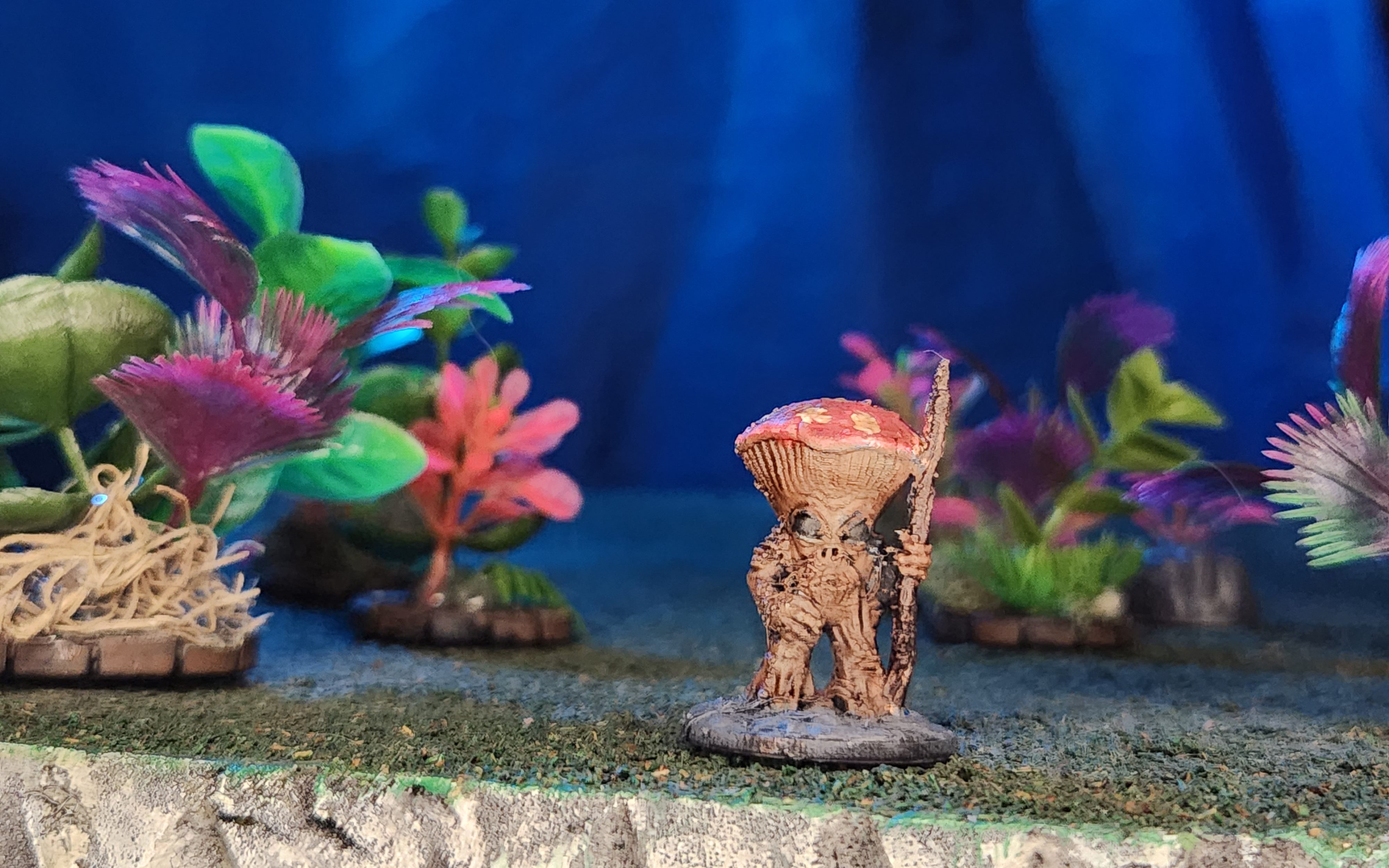 My daughter painted this miniature (Fat Dragon Games). I didn’t mention anything about the color scheme I used for them and she went in a different direction. These mushroomfolk look bright and would be a great NPC in a Feywild adventure. I will have to paint up a couple more like this to add to the collection. I might base up those mushrooms I got from the Dollar Tree and add them to a Feywild Scatter terrain set.