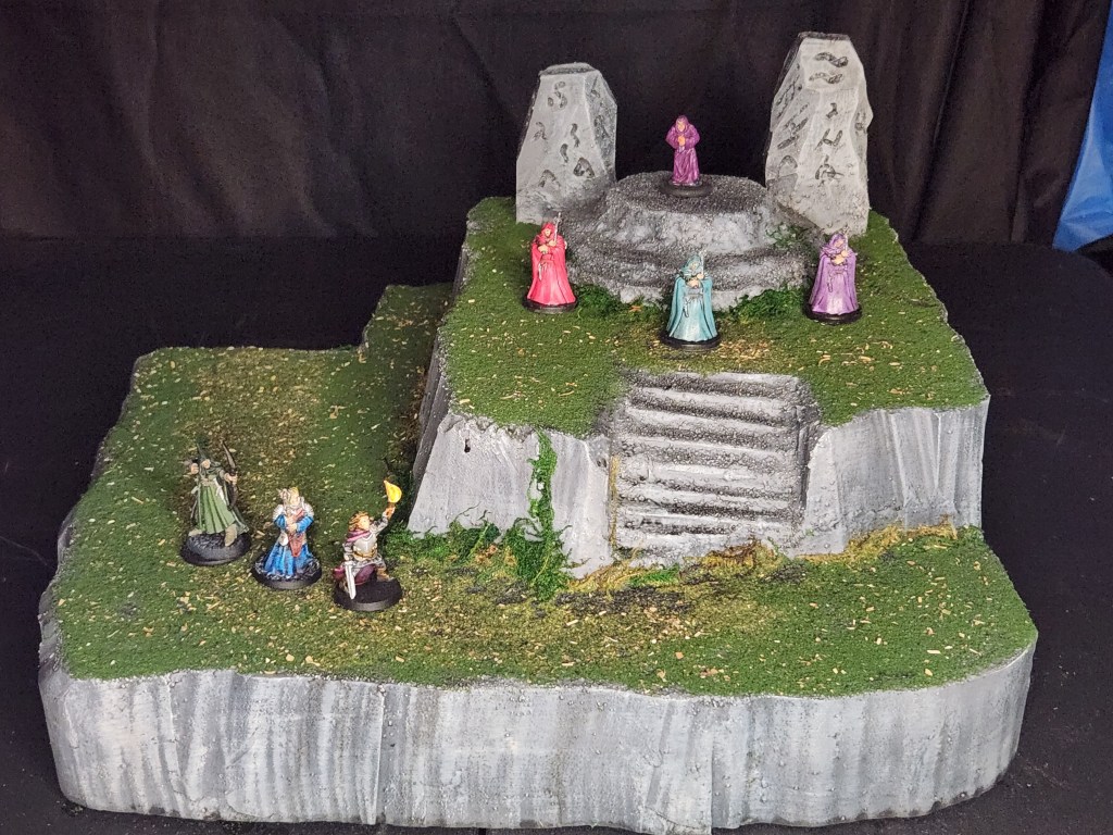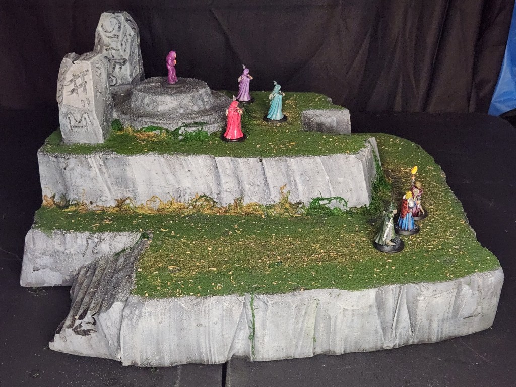 Here is the completed terrain piece I have been working on for the past week or two. The cultists in the front are from the Wrath of Ashardalon board game. I have had those painted for years. The cultist on the stone circle is actually Desaad from Heroclix on a new base.