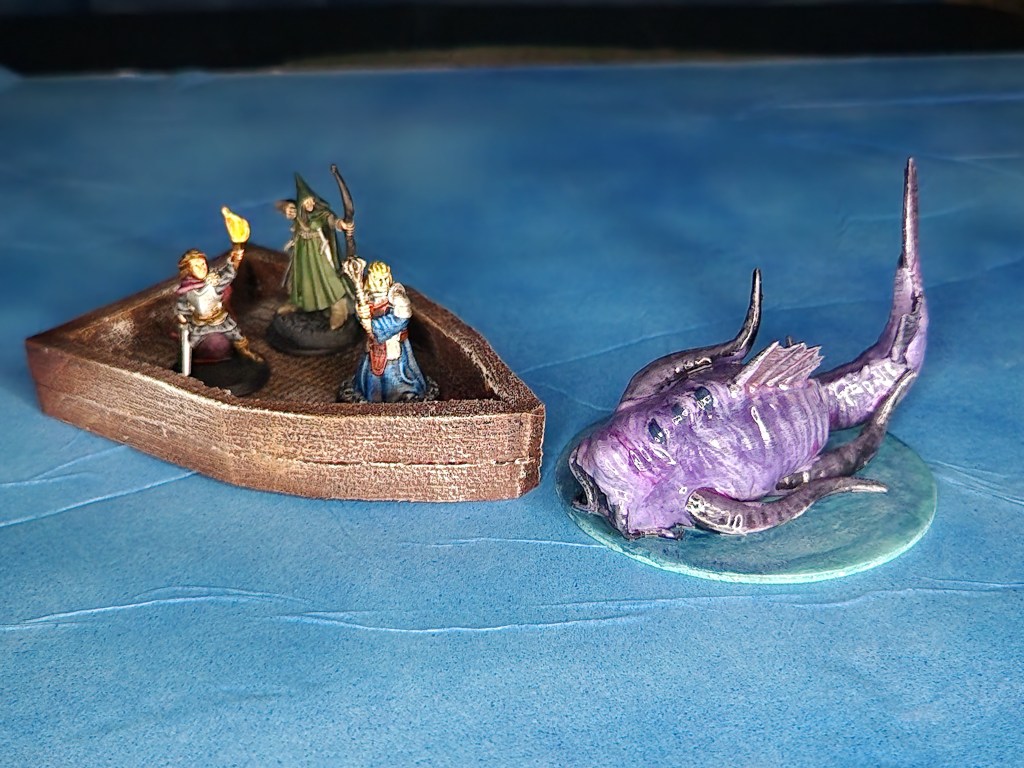 The aboleth (BriteMinis) was painted by the daughter, I just did the base which is just a 3″ wooden circle painted blue with some water effects on top. The heroes were done before and I have been using them in my Random Encounter posts. I placed this encounter on my sky background since I don’t have a water UDT yet… might be a good next project.
