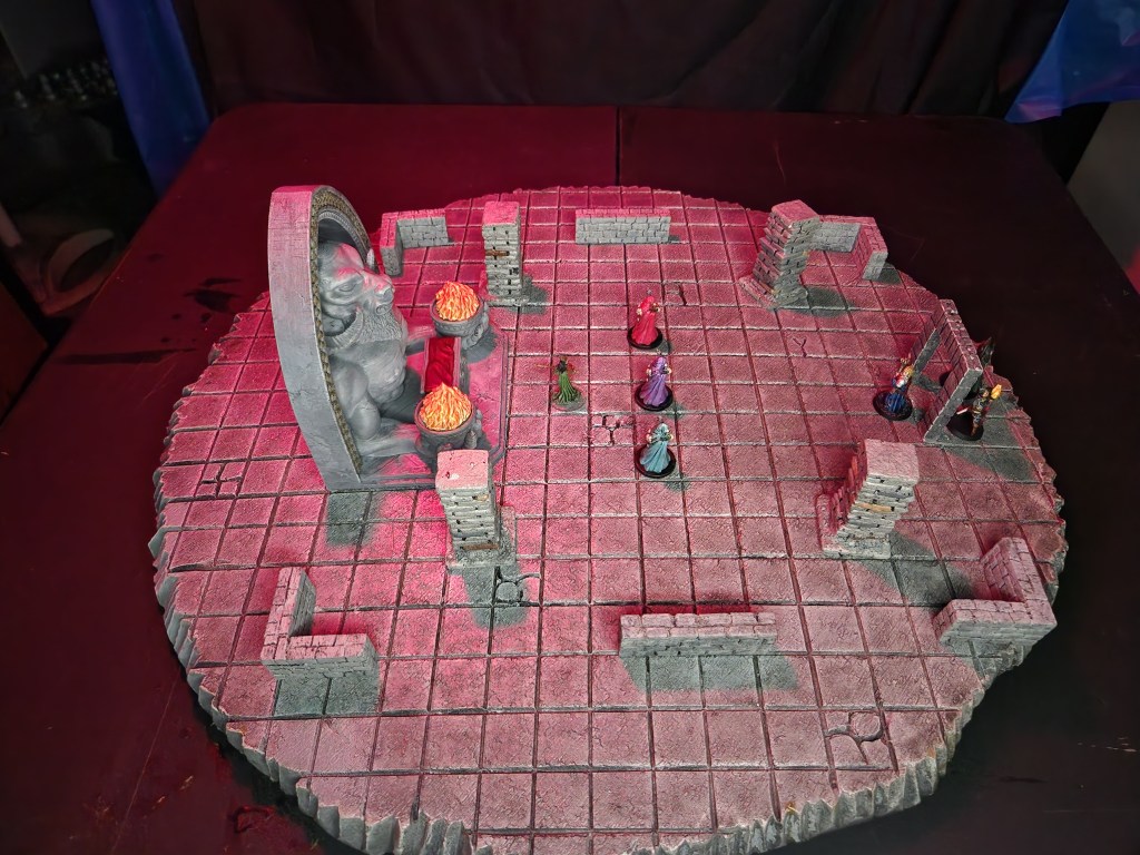 I would place three cultists (there are 3 PCs in the party) as well as the High Priestess near the altar. I would have the colored light too to include the otherworldly glow. In the pictures, I have my dungeon UDT set up with the UDT walls and corners to show where the boundaries of the room are.