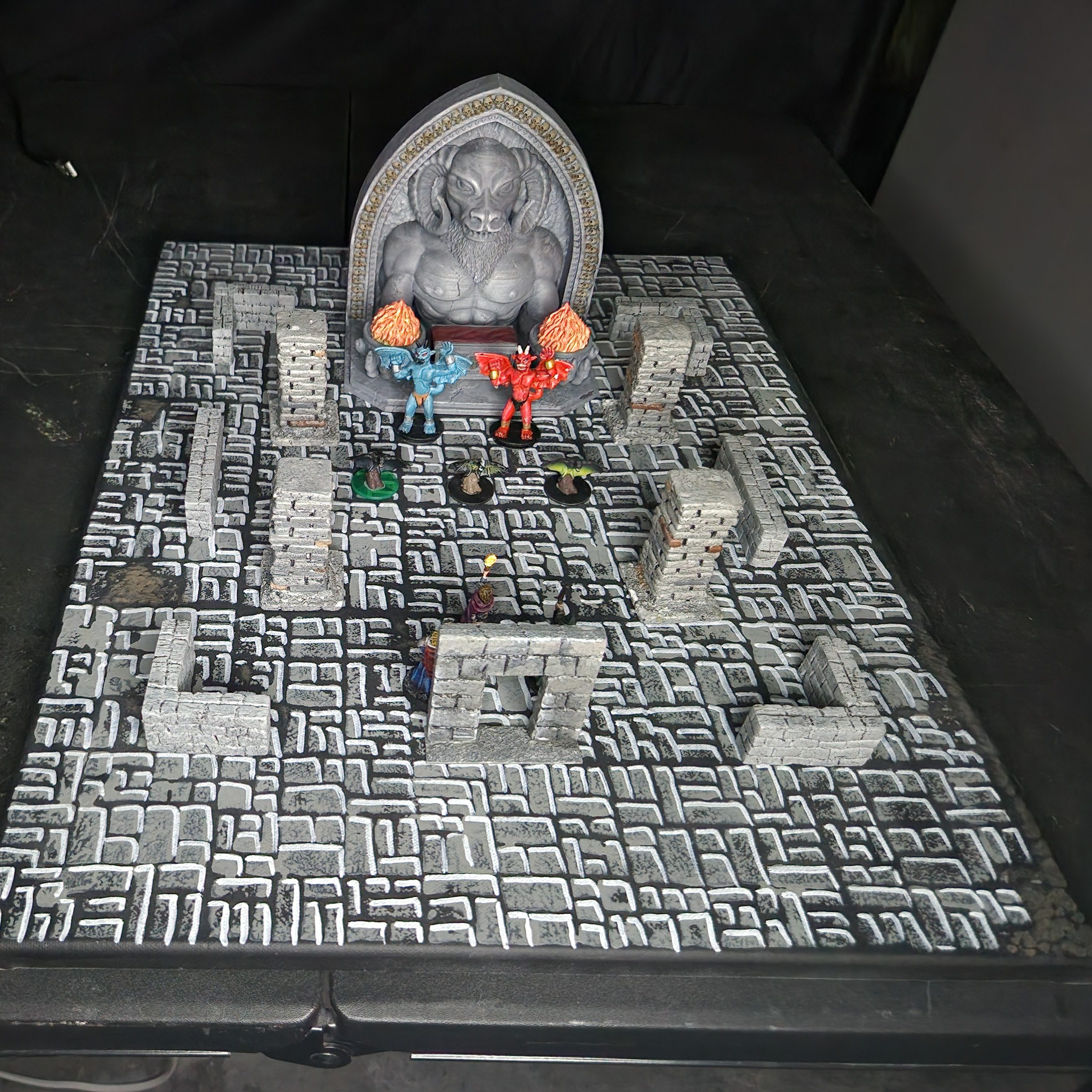 We start with the dungeon board made with a canvas from Broken Terrain’s YouTube Channel. We add some UDT walls, an open arch doorway, and some square pillars along with the Statue of Orcus.