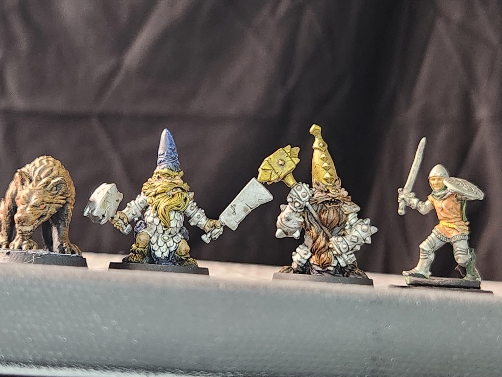 A wolf from BriteMinis, a pair of dwarves from massive Darkness, and a metal warrior. I recently repainted him since he was one fo the 1st miniatures that I ever painted. I used Testor enamel paints on him (I had those to paint model cars so I thought it should work here too).