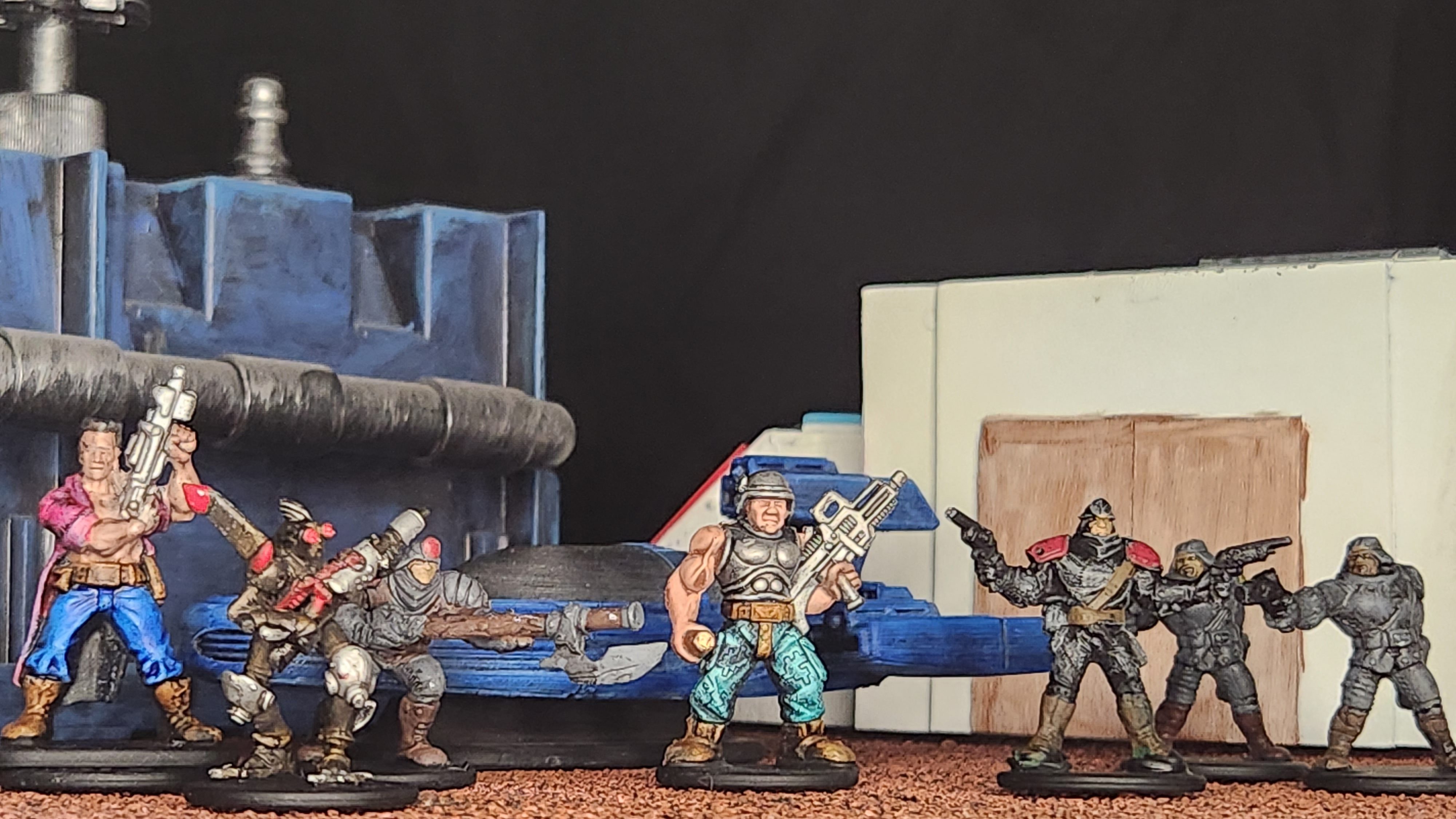 All of these miniatures are not 3D printed. The guy on the far left (who reminds me of Arnold Schwarzenegger for some reason) and the guy in the center are from eBay which I bought some years ago. The rest of the crew are Mage Knight figures that I just put on new plastic bases and gave a black wash. The blue landspeeder is 3D printed and painted by me. The buildings in the background are kitbashed from items around the house and a pipe set I got off the Internet. These guys would look good on a 5 Parsecs from Home game…