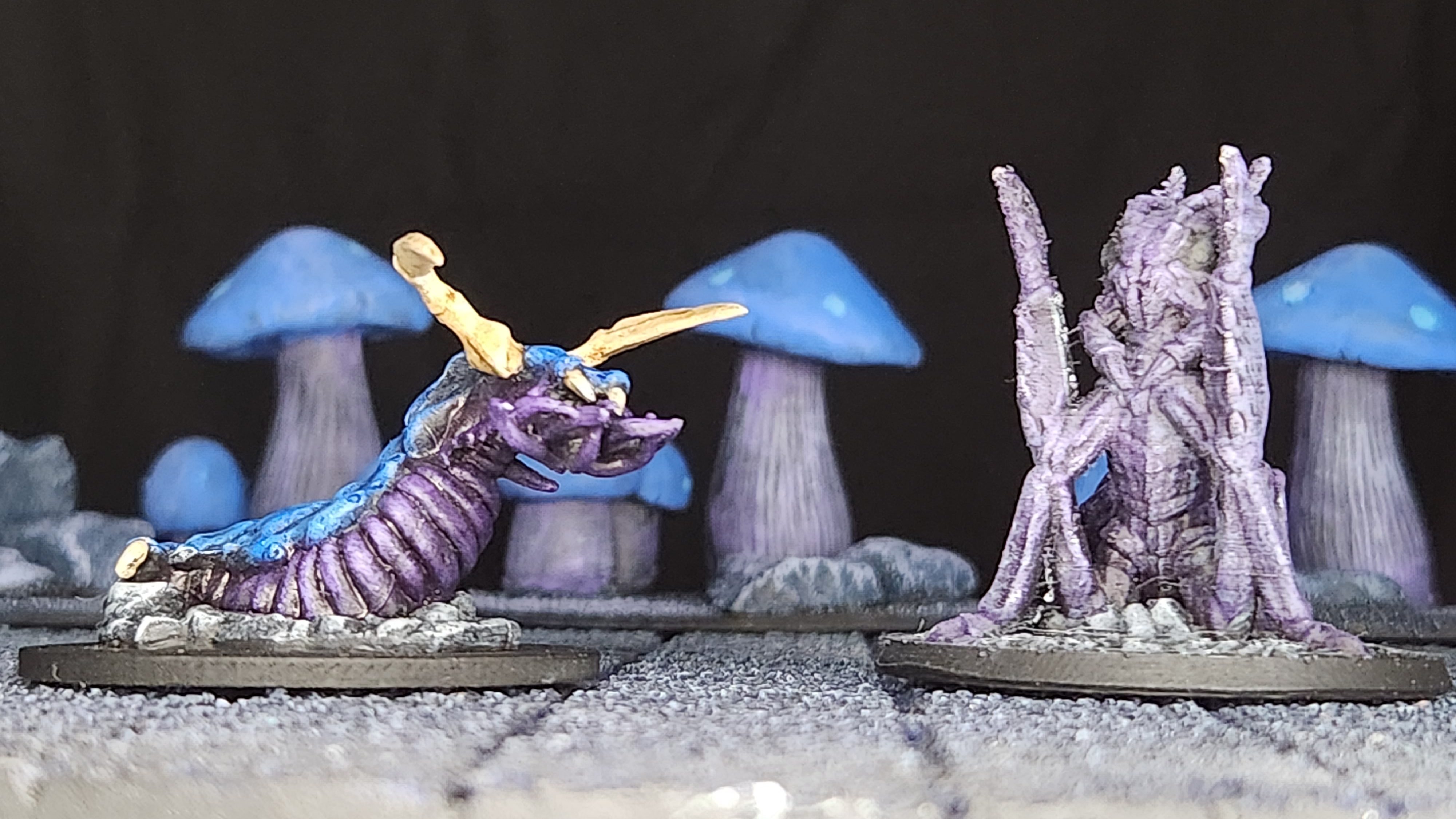 The centipede creature is from the Bone 5 Kickstarter and the Ankheg is from BriteMinis. I made the mushroom scatter terrain in the background from mushrooms and sand from Dollar Tree plus some real rocks.