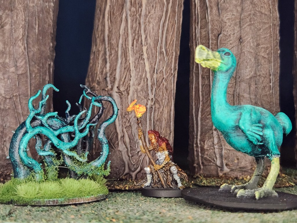 The vine and the druid are both from the Bones 5 Kickstarter. The axebeak is from Miguel Zavala, who gives by mz4250. He has modeled all of the creatures from the Monster Manual and has put them out for free! If you need something, google his handle and the creature’s name…you should find something that you can print. He has a Patreon you can join if you want to support him. The giant trees are new as well. I made them out of a pool noodle, paper towels, PVA glue, hot glue, and some homemade flocking.